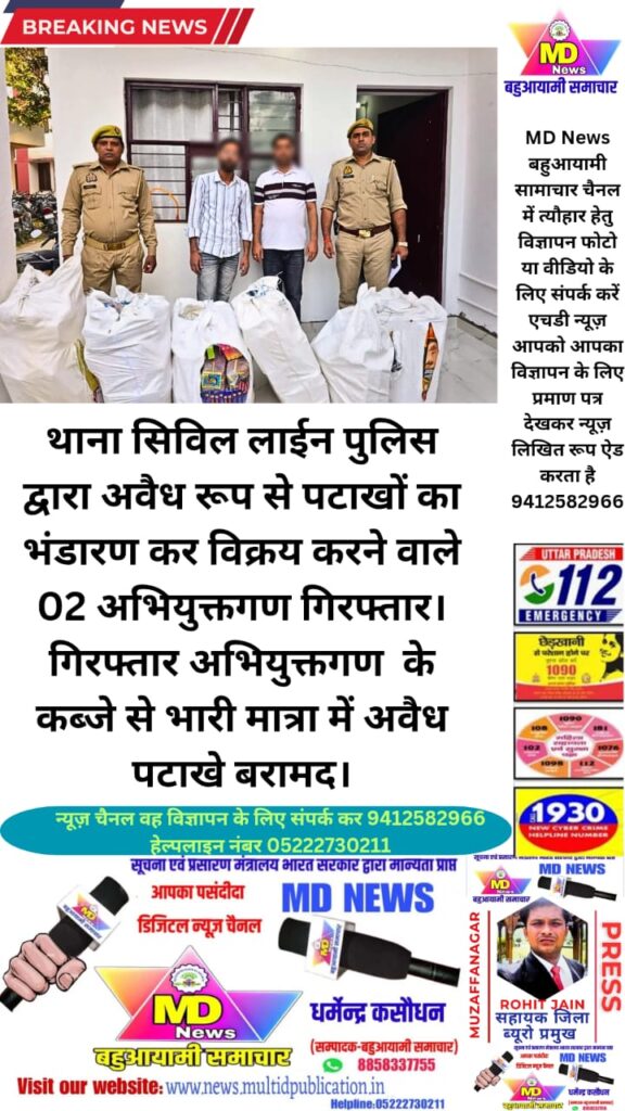 थाना सिविल लाईन पुलिस द्वारा अवैध रूप से पटाखों का भंडारण कर विक्रय करने वाले 02 अभियुक्तगण गिरफ्तार।