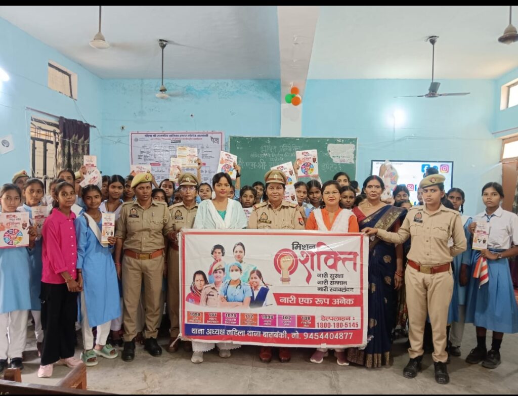 बाराबंकी:- पुलिस अधीक्षक अर्पित विजयवर्गीय के निर्देशानुसार अपर पुलिस अधीक्षक (उत्तरी) विकास चंद्र त्रिपाठी के कुशल पर्यवेक्षण में क्षेत्राधिकारी नगर संगम कुमार मुख्यमंत्री द्वारा चलाए जा रहे मिशन शक्ति फेज 0.5 महिला सशक्तिकरण अभियान के अंतर्गत राजकीय बालिका इंटर कॉलेज में एवं ग्रीड गंज में महिलाओं/बालिकाओं को नारी सुरक्षा जागरूकता अभियान चलाकर महिला थानाध्यक्ष मुन्नी सिंह व मिशन शक्ति टीम उप नि०शिव कांति पांडेय म०हे०कां०आशा यादव म०कां०आरती, म०कां० सोनी, म०का०प्राची पटेल, म०कां०पूजा के द्वारा बालिकाओं को नारी सुरक्षा सम्मान व स्वालंबन हेतु घरेलू हिंसा,बाल विवाह, पास्को एक्ट , गुड टच बैड टच व साइबर क्राइम संबंधी अपराध , महिला मिशन शक्ति केंद्र ,यातायात के नियमों बारे में जागरूक किया गया। छात्राओं को साइबर बुलिंग,1090 सेवाओं का प्रचार, एसिड अटैक, 112, पास्को एक्ट लघु फिल्म के माध्यम से जागरूक किया गया।उत्तर प्रदेश शासन द्वारा चलाये गये हेल्पलाइन नंबरों जैसे- 1076 मुख्यमंत्री हेल्पलाइन नंबर,1090 वूमेन पावर हेल्पलाइन नंबर,1098 चाइल्ड हेल्पलाइन नंबर,1930 साइबर हेल्पलाइन नंबर,112 पुलिस आपातकालीन सेवा,108 एंबुलेंस सेवा,102 स्वास्थ्य सेवा के बारे में जानकारी दी गई व सरकार द्वारा चलाई गई लाभकारी योजनाओं जैसे- सामूहिक विवाह योजना, कन्या सुमंगला योजना, वृद्धा पेंशन, विधवा पेंशन, आदि के बारे में भी विस्तृत जानकारी दी गई व पंपलेट वितरित किया गया। उनकी समस्याएं पूछी गई।