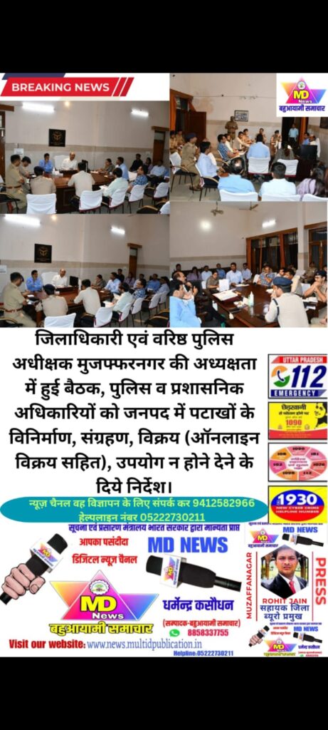 जनपद मुजफ्फरनगर जिलाधिकारी एवं वरिष्ठ पुलिस अधीक्षक की अध्यक्षता में हुई बैठक पुलिस व प्रशासनिक अधिकारियों को जनपद में पटाखों के विनिर्माण, संग्रहण, विक्रय (ऑनलाइन विक्रय सहित), उपयोग न होने देने के दिये निर्देश।
