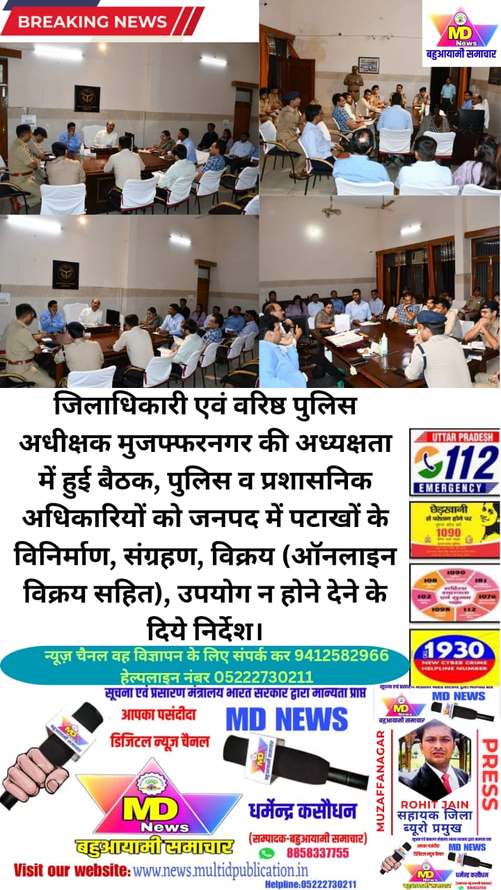 जनपद मुजफ्फरनगर जिलाधिकारी एवं वरिष्ठ पुलिस अधीक्षक की अध्यक्षता में हुई बैठक पुलिस व प्रशासनिक अधिकारियों को जनपद में पटाखों के विनिर्माण, संग्रहण, विक्रय (ऑनलाइन विक्रय सहित), उपयोग न होने देने के दिये निर्देश।