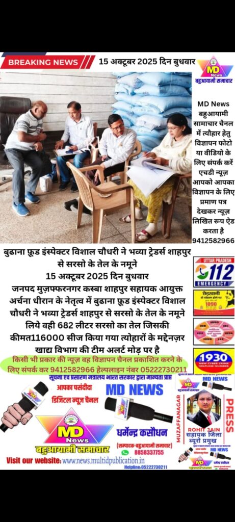 जनपद मुज़फ्फरनगर कस्बा शाहपुर सहायक आयुक्त अर्चना धीरान के नेतृत्व में बुढाना फ़ूड इंस्पेक्टर विशाल चौधरी ने भव्या ट्रेडर्स शाहपुर से सरसो के तेल के नमूने लिये वही 682 लीटर सरसो का तेल जिसकी कीमत116000 सीज किया गया त्योहारों के मद्देनज़र खाद्य विभाग की टीम अलर्ट मोड़ पर है