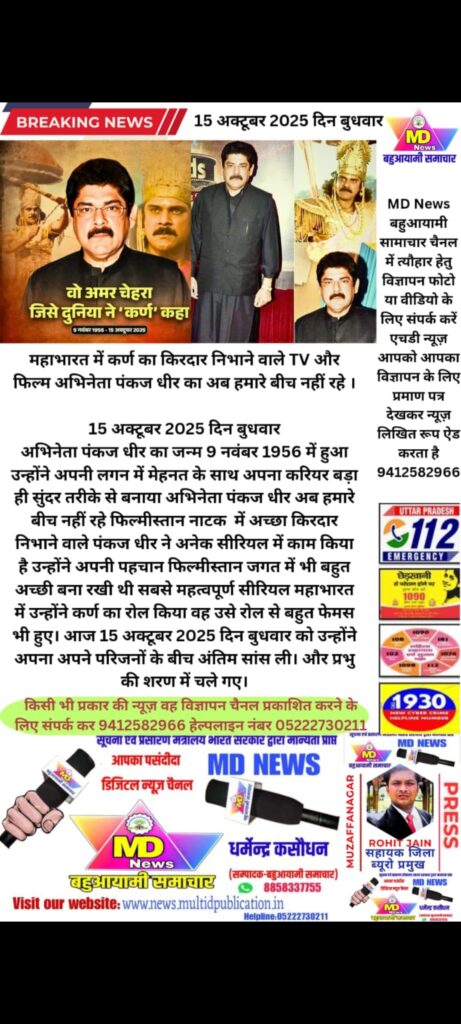 अभिनेता पंकज धीर का जन्म 9 नवंबर 1956 में हुआ उन्होंने अपनी लगन में मेहनत के साथ अपना करियर बड़ा ही सुंदर तरीके से बनाया अभिनेता पंकज धीर अब हमारे बीच नहीं रहे फिल्मीस्तान नाटक में अच्छा किरदार निभाने वाले पंकज धीर ने अनेक सीरियल में काम किया है उन्होंने अपनी पहचान फिल्मीस्तान जगत में भी बहुत अच्छी बना रखी थी सबसे महत्वपूर्ण सीरियल महाभारत में उन्होंने कर्ण का रोल किया वह उसे रोल से बहुत फेमस भी हुए। आज 15 अक्टूबर 2025 दिन बुधवार को उन्होंने अपना अपने परिजनों के बीच अंतिम सांस ली। और प्रभु की शरण में चले गए।