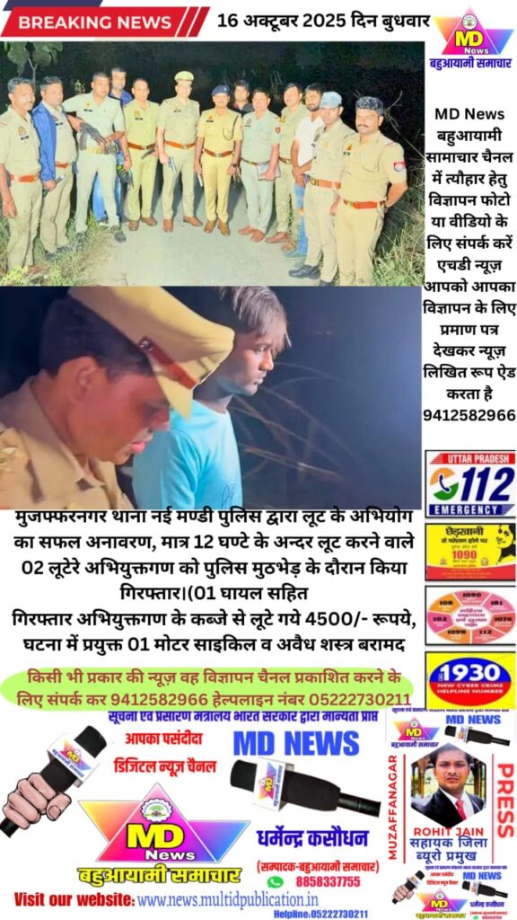 मात्र 12 घण्टे के अन्दर लूट करने वाले 02 लूटेरे अभियुक्तगण को पुलिस मुठभेड़ के दौरान किया गिरफ्तार।(01 घायल सहितगिरफ्तार अभियुक्तगण के कब्जे से लूटे गये 4500/- रूपये, घटना में प्रयुक्त 01 मोटर साइकिल व अवैध शस्त्र बरामदMD News बहुआयामी सामाचार चैनलजिला ब्यूरो प्रमुख रोहित जैन बुढ़ाना मुजफ्फरनगरजानपद मुजफ्फरनगर थाना नई मण्डी बृजेश कुमार शर्मा के कुशल नेतृत्व में थाना नई मण्डी पुलिस द्वारा की गयी कार्यवाही दिनांक 15.10.2025 को वादी आस मौहम्मद पुत्र मुश्ताक निवासी बिलासपुर थाना नई मण्डी, मुजफ्फरनगर द्वारा थाना नई मण्डी पुलिस को लिखित तहरीर देकर अवगत कराया कि 02 अज्ञात बदमाशों द्वारा मेरे पिता से पैसे लूटकर भागना व विरोध करने पर उन्हे गम्भीर रूप से घायल कर देने की घटना कारित की गयी है प्राप्त तहरीर के आधार पर थाना नई मण्डी पुलिस द्वारा मु0अ0सं0 514/25 धारा 309(6) बीएनएस पंजीकृत किया गया तथा अभियोग के सफल अनावरण हेतु थाना नई मण्डी पर पुलिस टीम का गठन किया गया दिनांक 15/16.10.2025 की रात्रि को थाना नई मण्डी पुलिस टीम को मुखबिर खास द्वारा सूचना प्राप्त हुई कि लूट की घटना कारित करने वाले 02 अभियुक्तगण थोडी देर में एटूजेड रोड से कही भागने की फिराक में है सूचना पर विश्वास करते हुए थाना नई मण्डी पुलिस टीम मुखबिर द्वारा बताये गये स्थान पर पहुंची तथा संदिग्ध व्यक्ति/वाहनों की चैकिंग करने लगी। कुछ समय पश्चात मोटरसाइकिल पर सवार 02 व्यक्ति आते हुए दिखाई दिये जिन्हे पुलिस टीम द्वारा चैकिंग हेतु रूकने का इशारा किया गया परन्तु बदमाशों द्वारा मोटर साइकिल को न रोकते हुए भागने का प्रयास किया, तेज गति होने के कारण बदमाशों की मोटरसाइकिल अनियंत्रित होकर गिर गयी। खुद को पुलिस टीम द्वारा घिरता देख बदमाशों द्वारा पुलिस टीम पर जान से मारने की नियत से फायर किया गया जिसमें पुलिस टीम बाल-बाल बची पुलिस टीम द्वारा आत्मरक्षार्थ सूक्ष्म जवाबी फायरिंग की गयी जिसमें 01 बदमाश इदरीश पुत्र अनीश निवासी बन्धेडी घायल हो गया जिसे पुलिस टीम द्वारा घायल अवस्था में गिरफ्तार किया गया तथा दूसरे बदमाश को भागने का मौका दिये बिना आवश्यक बल प्रयोग कर मौके से गिरफ्तार किया गया। गिरफ्तार अभियुक्तगण के कब्जे से लूटे गये 4500/- रूपये, 01 मोटर साइकिल व अवैध शस्त्र बरामद किये गये। घायल बदमाश को उपचार हेतु अस्पताल भिजवाया गया है। अभियुक्तगण की गिरफ्तारी एवं बरामदगी के सम्बन्ध में थाना नई मण्डी पुलिस द्वारा अग्रिम विधिक कार्यवाही की जा रही है। गिरफ्तार अभियुक्तगण का नाम व पता-*1.* इदरीश पुत्र अनीश निवासी बन्धेडी महावतपुर थाना सिविल लाइन रूडकी हरिद्वार(घायल) *2.* निहाल पुत्र नसीर आलम निवासी बन्धेडी महावतपुर थाना सिविल लाइन रूडकी हरिद्वारबरामदगी का विवरण- 01 होण्ड