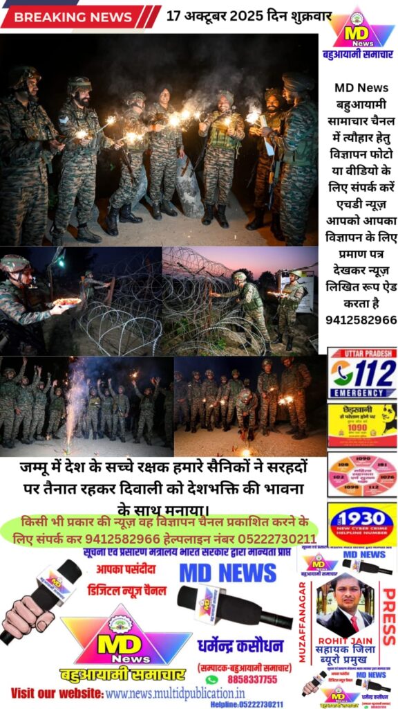 जम्मू देश के सच्चे रक्षक हमारे सैनिकों ने सरहदों पर तैनात रहकर दिवाली को देशभक्ति की भावना के साथ मनाया।MD News बहुआयामी सामाचार चैनलजिला ब्यूरो प्रमुख रोहित जैन बुढ़ाना मुजफ्फरनगरजम्मू कश्मीर भारतीय सेवा ने बनाई दिवाली त्योहार वह बॉर्डर की पूजा अर्चना कर दिवाली के पर्व फुलझड़ी वह अनार जलाकर खुशियां बनाई बहन परिवार जनों से बातचीत कर दिवाली की शुभकामनाएं बॉर्डर से ही परिवार के लोगों से बात कर कर खुशियों का जशन बनाया वह एक दूसरे के गले लगा बहुत खुशियां बनाई वह बॉर्डर पर सीमा की आरती कर वह दीपक रखकर सभी देशवासियों की बॉर्डर पर रहे कर ही दीवारों में चार चांद लगा दिया।