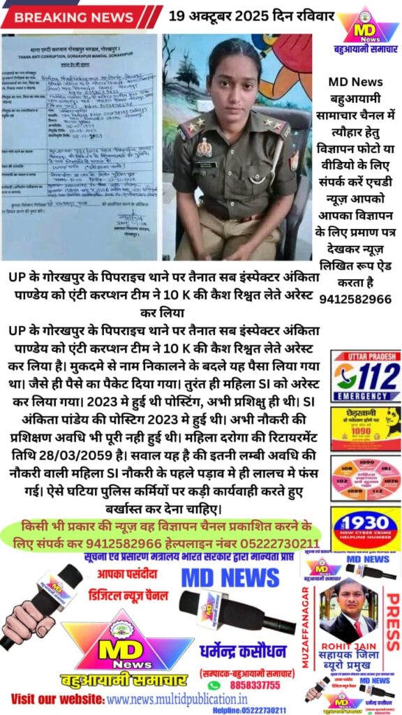 MD News बहुआयामी सामाचार चैनलजिला ब्यूरो प्रमुख रोहित जैन बुढ़ाना मुजफ्फरनगरUP के गोरखपुर के पिपराइच थाने पर तैनात सब इंस्पेक्टर अंकिता पाण्डेय को एंटी करप्शन टीम ने 10 K की कैश रिश्वत लेते अरेस्ट कर लिया है। मुकदमे से नाम निकालने के बदले यह पैसा लिया गया था। जैसे ही पैसे का पैकेट दिया गया। तुरंत ही महिला SI को अरेस्ट कर लिया गया। 2023 मे हुई थी पोस्टिंग, अभी प्रशिक्षु ही थी। SI अंकिता पांडेय की पोस्टिग 2023 मे हुई थी। अभी नौकरी की प्रशिक्षण अवधि भी पूरी नही हुई थी। महिला दरोगा की रिटायरमेंट तिथि 28/03/2059 है। सवाल यह है की इतनी लम्बी अवधि की नौकरी वाली महिला SI नौकरी के पहले पड़ाव मे ही लालच मे फंस गई। ऐसे घटिया पुलिस कर्मियों पर कड़ी कार्यवाही करते हुए बर्खास्त कर देना चाहिए।