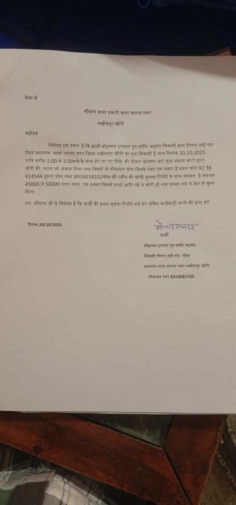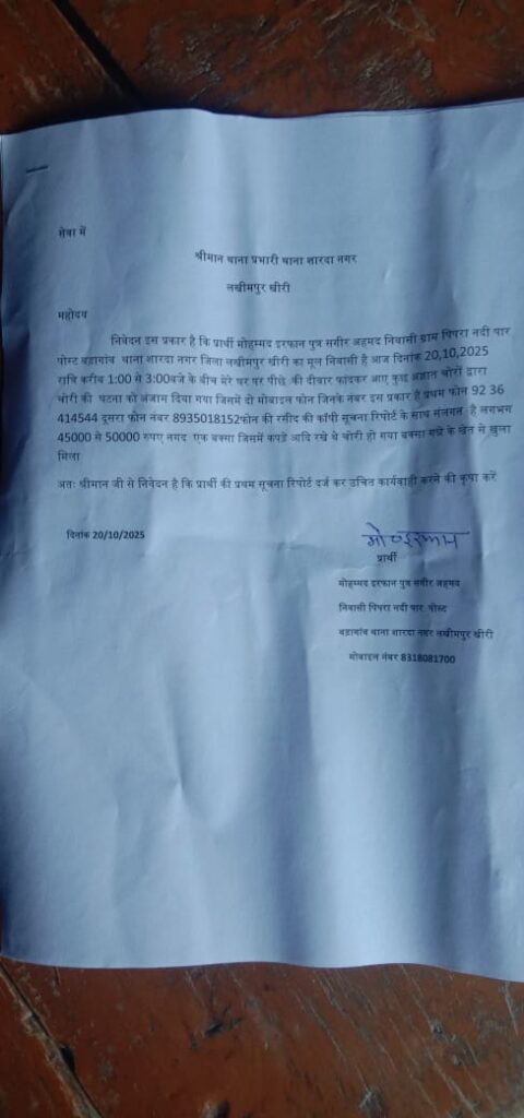 आपको बता दूं पूरा मामला थाना शारदा नगर ग्राम सभा पिपरा नदीपार का है। जहां बीती रात अज्ञात चोरों ने तकरीबन रात 1:00 बजे के बाद मोहम्मद इरफान पुत्र सगीर अहमद पिपरा नदीपार के घर से₹50000 नगद व दो मोबाइल चोरी हो गया। जिसकी सूचना पीड़ित ने थाना शारदा नगर को दी। थाना शारदा नगर प्रभारी ने पीड़ित को आश्वासन दिया है कि जल्द से जल्द चोरी का खुलासा होगा। अब देखना है कि कितने दिन में चोरी का खुलासा होता है या यूं ही चोरों के हौसले बुलंद रहेंगे।