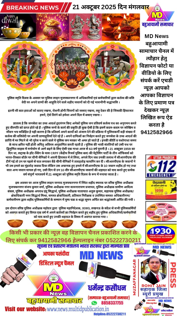 जनपद मुजफ्फरनगर पुलिस स्मृति दिवस के अवसर पर पुलिस लाइन जनपद में अधिकारियों एवं कर्मचारियों द्वारा कर्तव्य की बलि वेदी पर अपने प्राणों की आहूति देने वाले शहीद जवानों को दी गई भावभीनी श्रद्धांजलि।