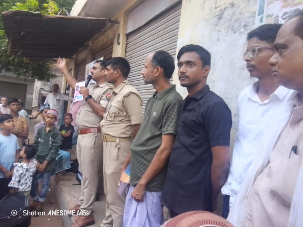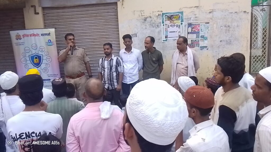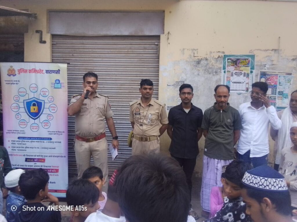 वाराणसी। दिनांक 22/10/2025 कमिश्नरेट वाराणसी जैतापुरा के मोहल्ला ख्वाजा पूरा बड़ी मस्जिद के पास मैदान मे। जागरूकता अभियान कार्यक्रम आयोजित हुआ। समाज सेवा सोसाइटी के माध्यम से कार्यक्रम प्रस्तुत किया। जिस मे मोहल्ले के लोग इकत्र हुए और वहां जैतापुरा si सौरभ सिंह एवं अन्य सिपाही ने इस अभियान के तहत सभी को साइबर अपराध से बचाव करने के लिए पुलिस की सहायताप्राप्त करने की जानकारी दी। और लोन ऐप फाँड