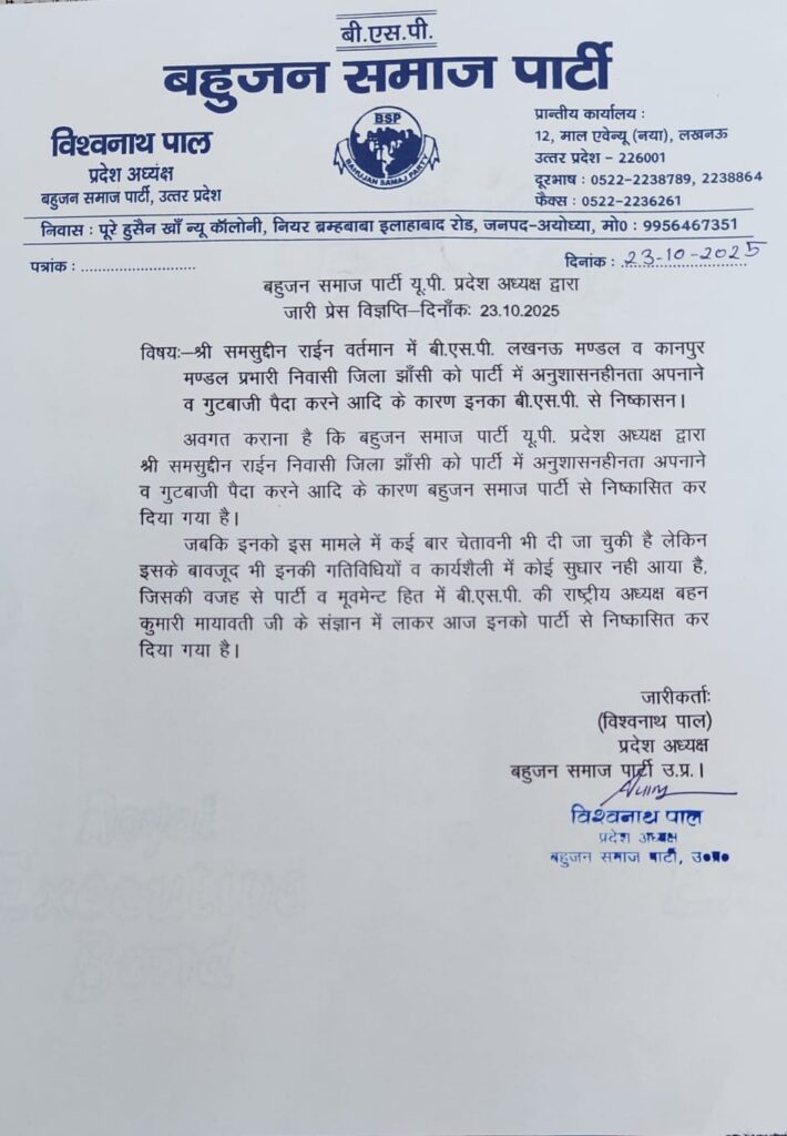 बाराबंकी/उत्तर प्रदेश ।बहुजन समाज पार्टी की राष्ट्रीय अध्यक्ष बहन कुमारी मायावती जी के दिशा निर्देश पर प्रदेश अध्यक्ष विश्वनाथ पाल ने शमसुद्दीन राईन वर्तमान लखनऊ व कानपुर प्रभारी निवासी जिला झांसी को पार्टी में अनुशासन अपनाने व गुटबाजी पैदा करने आदि के कारण इनका बीएसपी पार्टी से निष्कासन कर दिया गया है जबकि इनको इस मामले में कई बार चेतावनी भी दी जा चुकी है।