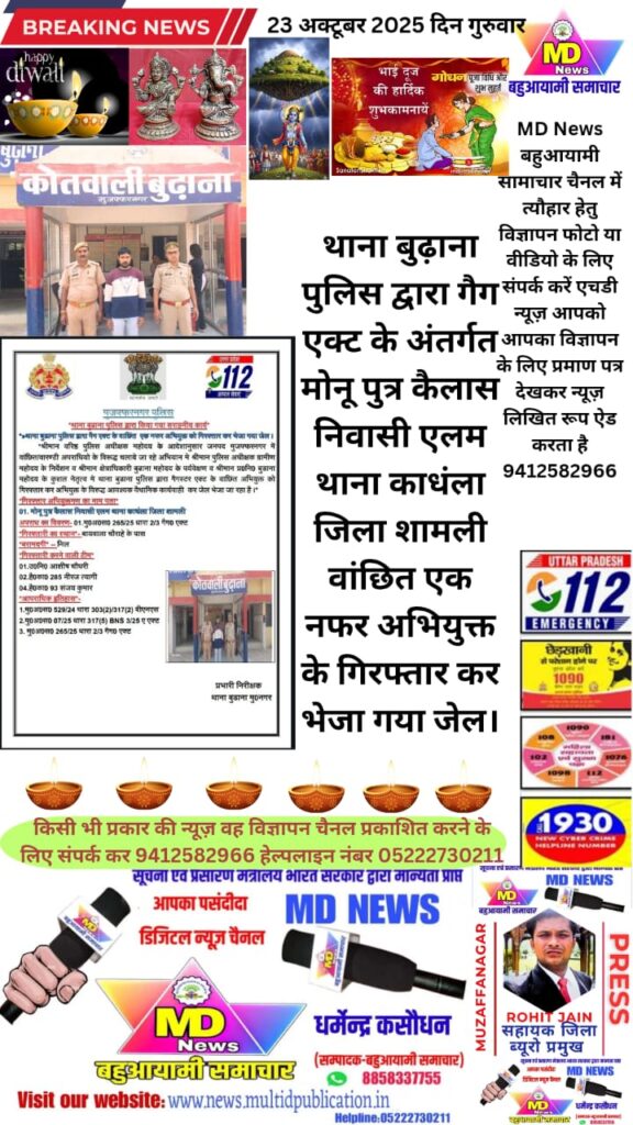 MD News बहुआयामी सामाचार चैनलजिला ब्यूरो प्रमुख रोहित जैन बुढ़ाना मुजफ्फरनगर23अक्टूबर2025 दिन गुरुवारजनपद मुजफ्फरनगर कस्बा बुढ़ाना थाना पुलिस द्वारा गैंग एक्ट के वाछिंत एक नफर अभियुक्त को गिरफ्तार कर भेजा गया जेल।वरिष्ठ पुलिस अधीक्षक महोदय के आदेशानुसार जनपद मुजफ्फरनगर में वांछित/वारण्टी अपराधियो के विरूद्ध चलाये जा रहे अभियान मे पुलिस अधीक्षक ग्रामीण महोदय के निर्देशन व क्षेत्राधिकारी बुढाना महोदय के पर्यवेक्षण व थाना प्र०नि० बुढाना महोदय के कुशल नेतृत्व मे थाना बुढाना पुलिस द्वारा गैंगस्टर एक्ट के वाछिंत अभियुक्त को गिरफ्तार कर अभियुक्त के विरुद्ध आवश्यक वैधानिक कार्यवाही कर जेल भेजा जा रहा है।”गिरफ्तार अभियुक्तगण का नाम पता”01. मोनू पुत्र कैलास निवासी एलम थाना काधंला जिला शामलीअपराध का विवरण- 01. मु0अ0स0 265/25 धारा 2/3 गैंग0 एक्ट”गिरफ्तारी का स्थान बायवाला चौराहे के पासबरामदगी – निलगिरफ्तारी करने वाली टीम”01.उ0नि0 आशीष चौधरी02. है0का0 285 नीरज त्यागी04.है0का0 93 संजय कुमार”आपराधिक इतिहास-1.मु0अ0स0 529/24 धारा 303(2)/317 (2) बीएनएस2. मु0अ0स0 07/25 धारा 317 (5) BNS 3/25 ए एक्ट3. मु0अ0स0 265/25 धारा 2/3 गैग0 एक्ट