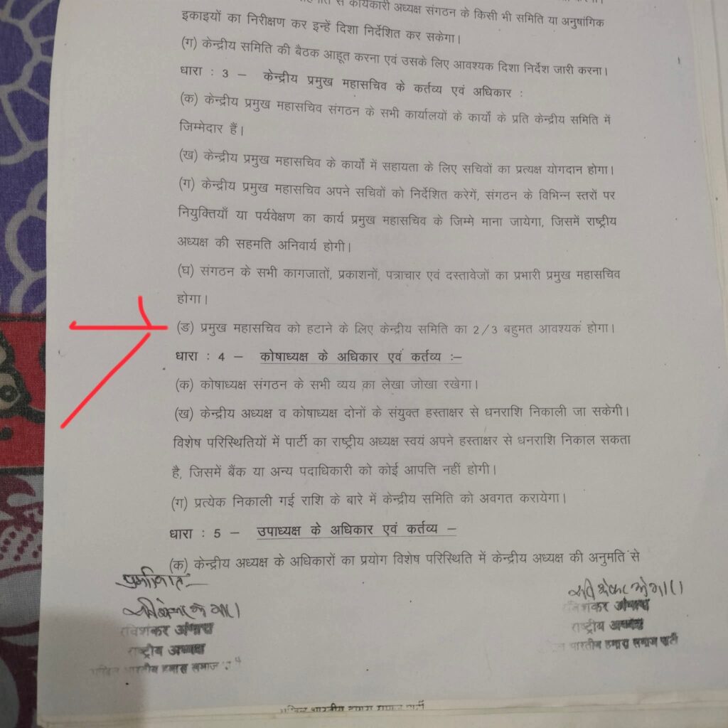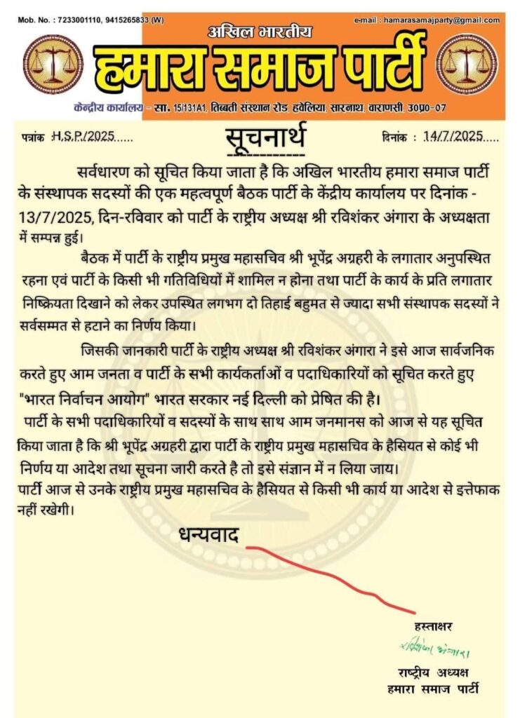 संवाददाता-ओम प्रकाश साहू (लखनऊ)अखिल भारतीय हमारा समाज पार्टी के दो तिहाई से ज्यादा (जिनकी संख्या 91) संस्थापक सदस्यों ने पार्टी के राष्ट्रीय प्रमुख महासचिव श्री भूपेंद्र कुमार अग्रहरी को उनके पद से हटा दिया है। जिसकी जानकारी पार्टी के पदाधिकारियों व कार्यकर्ताओं को पूर्व में दी जा चुकी थी। परंतु श्री भूपेंद्र कुमार अग्रहरी द्वारा बार-बार अपने आप को राष्ट्रीय प्रमुख महासचिव लिखना व सभी पदाधिकारियों,कार्यकर्ताओं तथा आम जनमानस को भ्रमित करने को लेकर पार्टी ने इस पोस्ट को पुनः जारी की है। आप सभी पदाधिकारियों व कार्यकर्ताओं तथा आम जनमानस से अपील करती हु कि श्री भूपेंद्र कुमार अग्रहरी अब पार्टी के राष्ट्रीय प्रमुख महासचिव नहीं है तथा उन्हें उनके पद से संवैधानिक तरीके से पूर्व में ही हटाया जा चुका है। अब अगर वह पार्टी के पदाधिकारी के रूप में कोई पोस्ट डालते हैं तो कृपया उसे संज्ञान में न लिया जाए। किसी को इस कार्यवाही या संस्थापक सदस्यों के हस्ताक्षर का सत्यापन करना या कराना हो तो वह इन हस्ताक्षर किए हुए संस्थापक सदस्यों से मिलकर उनसे सत्यापन कर सकते है। पार्टी के रजिस्ट्रेशन में कुल (120) संस्थापक सदस्य रजिस्टर्ड है, जिसमें से दो तिहाई सदस्य (80) होते है। पर इस निर्णय में दो तिहाई से ज्यादा कुल (91) सदस्यों का हस्ताक्षर प्राप्त है।बता दें की पार्टी आलाकमान ने तर्क दिया है कि भुपेंद्र अग्रहरि काफी समय से पार्टी के किसी भी कार्यक्रम में सक्रिय नहीं थे।