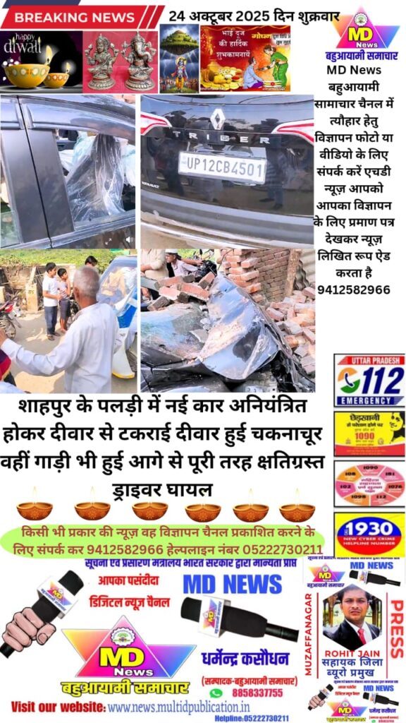 शाहपुर के पलड़ी में नई कार अनियंत्रित होकर दीवार से टकराई दीवार हुई चकनाचूर वहीं गाड़ी भी हुई आगे से पूरी तरह क्षतिग्रस्त ड्राइवर घायल
