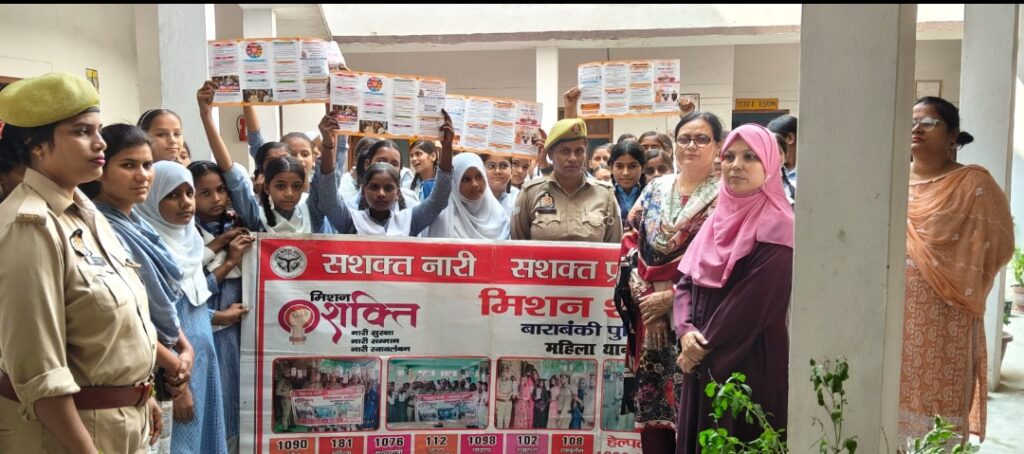 बाराबंकी:- पुलिस अधीक्षक अर्पित विजयवर्गीय के निर्देशानुसार अपर पुलिस अधीक्षक (उत्तरी) विकास चंद्र त्रिपाठी के कुशल पर्यवेक्षण एवं क्षेत्राधिकारी नगर संगम कुमार के मार्गदर्शन में उत्तर प्रदेश मुख्यमंत्री द्वारा चलाए जा रहे मिशन शक्ति फेज-5.0 महिला सशक्तिकरण अभियान के अंतर्गत महिला थानाध्यक्ष मुन्नी सिंह के नेतृत्व में मिशन शक्ति टीम म0हे0कां0 आशा यादव म0का0-शिखा, म0कां0प्रीति, म0कां0 सिंधु, म0कां0 आरती, म0कां0 सोनी एवं म0कां0 संध्या के द्वारा जमील-उर- रहमान किदवई इस्लामियां इंटर कॉलेज व दक्खिन टोला बंकी में महिलाओं एवं बच्चियों को नारी सुरक्षा सम्मान व स्वालंबन हेतु घरेलू हिंसा,बाल विवाह, पास्को एक्ट , गुड टच-बैड टच व साइबर क्राइम संबंधी अपराध , महिला मिशन शक्ति केंद्र ,यातायात के नियमों के बारे में जागरूक किया। उत्तर प्रदेश शासन द्वारा चलाये गये सभी इमरजेंसी हेल्पलाइन नंबरो-1076 मुख्यमंत्री हेल्पलाइन नंबर,1090 वूमेन पावर हेल्पलाइन नंबर,1098 चाइल्ड हेल्पलाइन नंबर,1930 साइबर हेल्पलाइन नंबर,112 पुलिस आपातकालीन सेवा,108 एंबुलेंस सेवा एवं 102 स्वास्थ्य सेवा के बारे में विधिवत जानकारी दी व उत्तर प्रदेश सरकार द्वारा चलाई गई लाभकारी योजनाओं जैसे- सामूहिक विवाह योजना, कन्या सुमंगला योजना, वृद्धा पेंशन, विधवा पेंशन, आदि के बारे में भी विस्तृत जानकारी देते हुए पंपलेट भी वितरित किए और उनकी समस्याएं पूछी किसी ने कोई भी समस्या नहीं बताई।