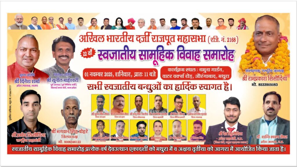 दर्जी राजपूत महासभा द्वारा आगामी 1 नवंबर 2025 को मथुरा में भव्य महासम्मेलन आयोजित किया जा रहा है।