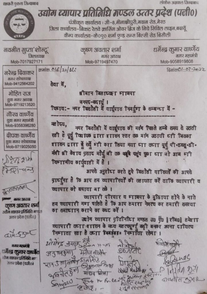 बदायूँ : उद्योग व्यापार प्रतिनिधि मंडल उत्तर प्रदेश के तत्वधान में प्रदेश युवा अध्यक्ष नवनीत गुप्ता शोंटू एवं नगर अध्यक्ष बिसौली कृष्णावतार शर्मा के नेतृत्व में व्यापारियों का शिष्ट मंडल जिला भाजपा कार्यालय पर राजीव कुमार गुप्ता जिलाध्यक्ष भाजपा से भेंट कर शासन से बिसौली बाईपास की स्वीकृति दिलाए जाने के लिए मांगपत्र सौंपा। इस अवसर पर प्रदेश युवा अध्यक्ष नवनीत गुप्ता शोंटू ने बताया कि व्यापार मंडल की ओर से बिसौली बाईपास को लेकर वर्षो से मांग चली आ रही है । जिसको लेकर पूर्व विधायक कुशाग्र सागर द्वारा इसकी पैरवी भी की गई थी। वर्तमान में उद्योग बंधु बैठक में संगठन के मांग पर प्रशासन द्वारा बिसौली बाईपास का इस्टीमेट शासन को भेजा गया है उन्होंने राजीव गुप्ता को मांगपत्र सोपते हुए अनुरोध किया कि शासन स्तर पर पैरवी कर बिसौली बाईपास की स्वीकृति प्रदान की जाए जिससे बिसौली का चहुंमुखी विकास के साथ साथ व्यापारियों को भी लाभ मिलेगा। बिसौली नगर अध्यक्ष कृष्णावतार शर्मा ने बताया कि नगर बिसौली में बड़े वाहनों के आवागमन से अक्सर जाम व दुर्घटनाएं होती रहती है तथा व्यापारियों को भी खासी दिक्कतों का सामना करना पड़ता है इसलिए यहां बाईपास की नितांत आवश्यकता है।