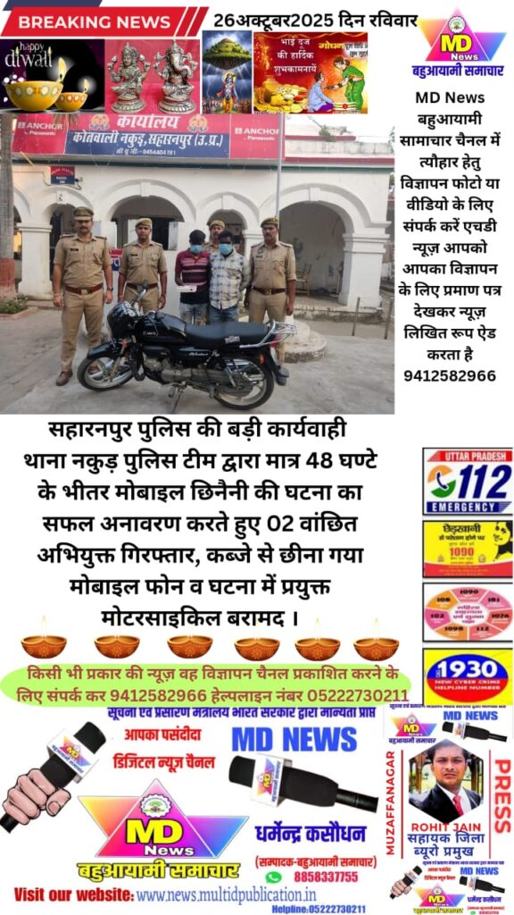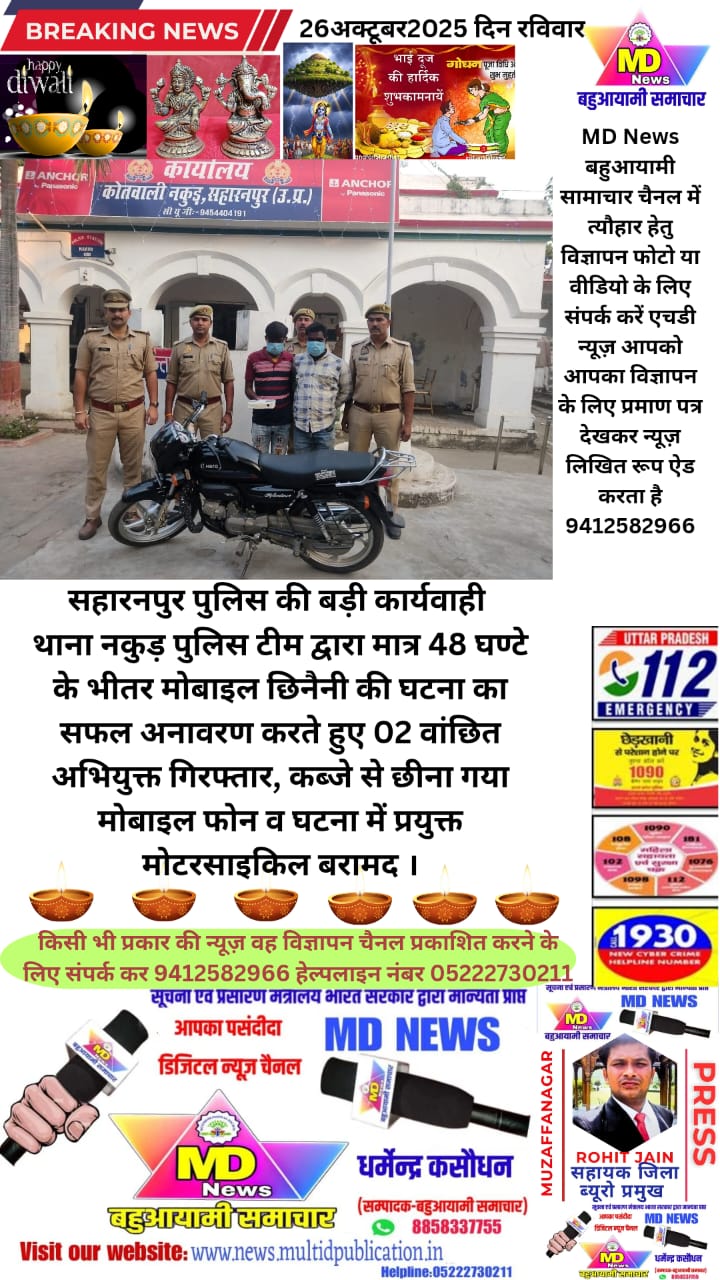 थाना नकुड़ पुलिस टीम द्वारा मात्र 48 घण्टे के भीतर मोबाइल छिनैनी की घटना का सफल अनावरण करते हुए 02 वांछित अभियुक्त गिरफ्तार, कब्जे से छीना गया मोबाइल फोन व घटना में प्रयुक्त मोटरसाइकिल बरामद।