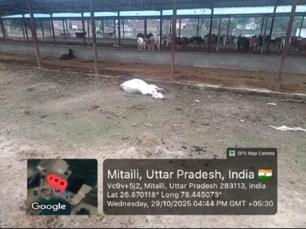 आगरा जिला के पिनाहट ब्लॉक के मितायली गौ शाला मे मृत पड़ी 4 गाय, भूख से तड़पती नजर आयी गाय, केयर टेकर ने नहीं खोला दरवाजा, ग्रामीणों ने इसका विरोध किया