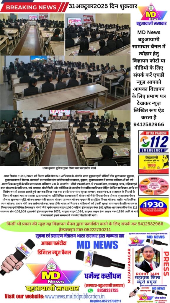आज दिनांक 31/10/2025 को मिशन शक्ति फेस 5.0 अभियान के अंतर्गत थाना बुढ़ाना एन्टी रोमियों टीम द्वारा कस्वा बुढ़ाना, मुजफ्फरनगर में मैपल्स अकादमी व राजकीय इंटर कॉलेज गड़ी सखावत, बुढ़ाना, मुजफ्फरनगर में बालक वालिकाओं को नये अपराधिक कानूनों के प्रति जागरुकता अभियान 2.0 के अन्तर्गतः- जीरो एफआईआर, ई-एफआईआर, समयबद्ध न्याय, महिला एवं बाल संरक्षण के प्राविधान, नये अपराध, प्रोधौगिकी और फोरेंसिक के उपयोग से संबधित प्राविधान पीड़ित केन्द्रित प्राविधान आदि पर विशेष रूप से प्रकाश डालते हुये जागरुक किया गया तथा इसके साथ-साथ सुरक्षा सम्मान, स्वावलंबन, व यातायात के नियमों के विषय में बताया गया व सरकार द्वारा चलाई जा रहीं विभिन्न कल्याणकारी योजनाओं जैसे-विधवा पेंशन योजना वृध्दावस्था पेंशन योजना सुकन्या समृद्धि योजना प्रधानमंत्री आवास योजना उज्ज्वल योजना मुख्यमंत्री सामूहिक विवाह योजना, राष्ट्रीय पारिवारिक लाभ योजना, प्रधान मंत्री जन अरोग्य योजना, नशा मुक्ति भारत अभियान व महिलाओं को उनकी सुरक्षा व सम्मान के प्रति जागरूक किया गया एवं विभिन्न हेल्पलाइन नंबरों जैसे चूमेन पावर लाइन-1090 महिला हेल्पलाइन नंबर 181 पुलिस आपातकालीन सेवा 112 स्वास्थय सेवा-102,108 मुख्यमंत्री हेल्पलाइन नंवर 1076, चाइल्ड लाइन 1098, साइबर क्राइम हेल्प लाइन नंबर-1930 आदि के बारे में जानकारी इनके सम्बन्ध में पंम्पलेट वितरित की गयी।