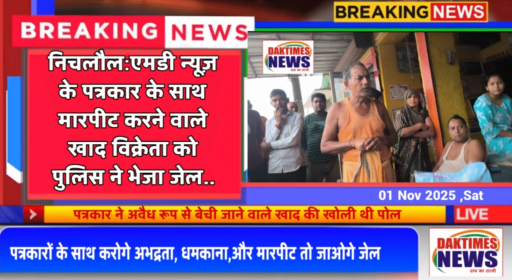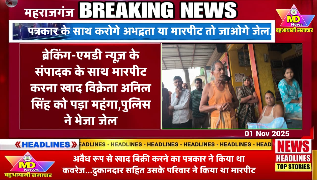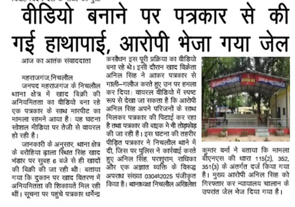 महराजगंज। निचलौल थाना क्षेत्र के बरोहिया ढाला स्थित सिंह खाद भण्डार के मालिक अनिल सिंह को एक पत्रकार पर हमला करने और अवैध रूप से खाद बेचने के मामले में गिरफ्तार कर जेल भेज दिया गया है। यह घटना शनिवार सुबह की है, जिसने पूरे क्षेत्र में हड़कंप मचा दिया है और सोशल मीडिया पर मारपीट का वीडियो तेज़ी से वायरल हो रहा है। शनिवार सुबह लगभग 6:30 बजे, पत्रकार धर्मेंद्र कसौधन को बरोहिया ढाला स्थित सिंह खाद भण्डार पर दर्जनों वाहनों में अवैध रूप से खाद भरे जाने की सूचना मिली। पत्रकार कसौधन दुकान से लगभग 100 मीटर की दूरी से घटना की कवरेज कर रहे थे।