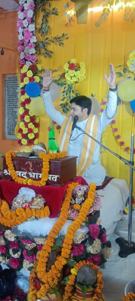 कथा वाचन वृंदावन से पधारे श्री अमित मोहन व्यास जी महाराज अपने श्रीमुख से कर रहे हैं।शनिवार को कथा का छठा दिन रूक्मणी विवाह के शुभ प्रसंग के रूप में मनाया गया। कथा के दौरान व्यास जी महाराज ने भगवान श्रीकृष्ण और रूक्मणी जी के विवाह प्रसंग का अत्यंत मनोहर वर्णन किया। विवाह गीतों, भजनों और ढोल-नगाड़ों की गूंज से पूरा परिसर भक्तिमय हो उठा। श्रद्धालुओं ने पुष्प वर्षा कर आनंद व्यक्त किया और श्रीकृष्ण-रूक्मणी विवाह की झांकी का आनंद लिया।इससे पूर्व शुक्रवार को श्रीकृष्ण जन्मोत्सव धूमधाम से मनाया गया था,
