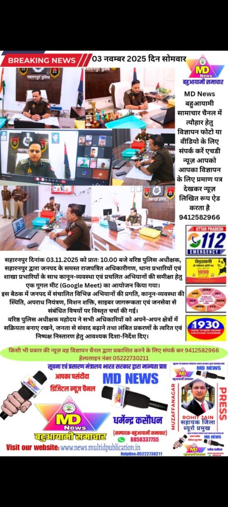 दिनांक 03 नवम्बर 2025 को प्रातः 10.00 बजे वरिष्ठ पुलिस अधीक्षक, सहारनपुर द्वारा जनपद के समस्त राजपत्रित अधिकारीगण, थाना प्रभारियों एवं शाखा प्रभारियों के साथ कानून-व्यवस्था एवं प्रचलित अभियानों की समीक्षा हेतु एक गूगल मीट (Google Meet) का आयोजन किया गया।