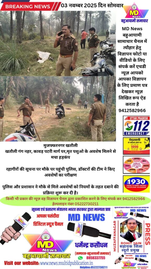 मृत पशुओ के अवशेष मिलने से मचा हड़कंपरहागीरों की सूचना पर मौके पर पहुंची पुलिसMD News बहुआयामी सामाचार चैनलजिला ब्यूरो प्रमुख रोहित जैन जनपद मुजफ्फरनगर03नवम्बर2025 दिन सोमवार जनपद मुजफ्फरनगर खतौली खतौली गंग नहर, कावड़ पटरी मार्ग पर,मृत पशुओ के अवशेष मिलने से मचा हड़कंपरहागीरों की सूचना पर मौके पर पहुंची पुलिस, डॉक्टरों की टीम ने किए अवशेषों का परीक्षणपुलिस और प्रशासन ने मौके से मिले अवशेषों को नियमों के तहत दबाने की प्रक्रिया शुरू कर दी है।
