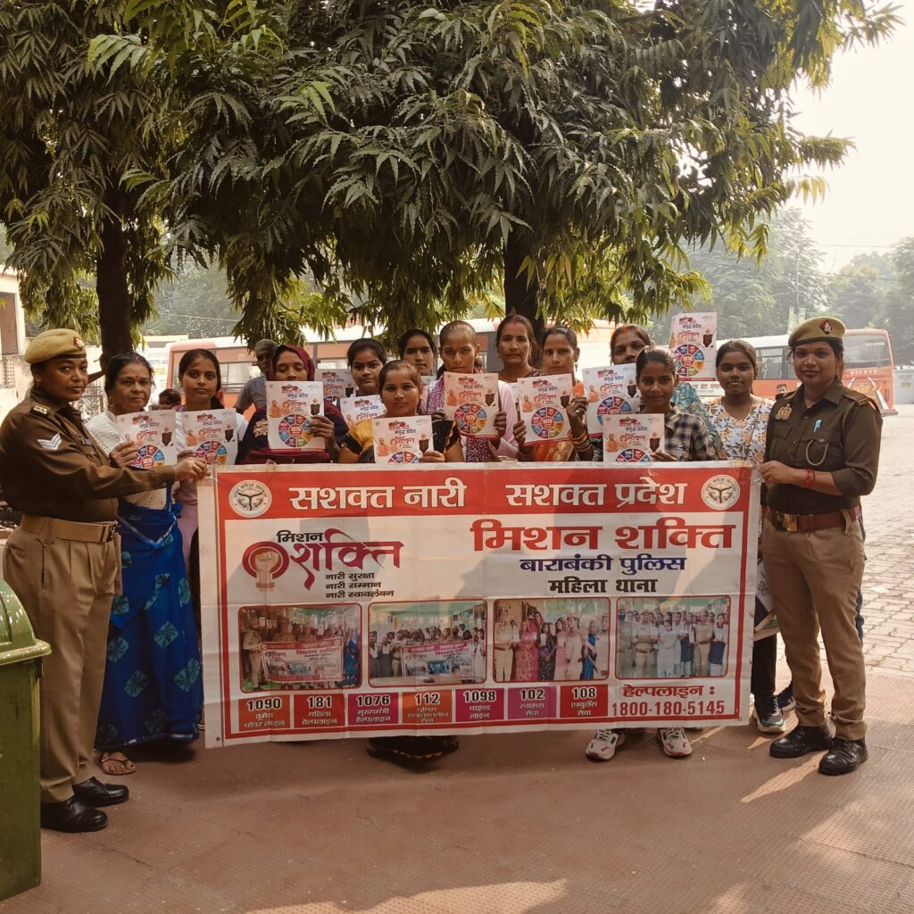 बाराबंकी:- पुलिस अधीक्षक अर्पित विजयवर्गीय के निर्देशानुसार अपर पुलिस अधीक्षक (उत्तरी) विकास चंद्र त्रिपाठी के कुशल पर्यवेक्षण एवं क्षेत्राधिकारी नगर संगम कुमार के मार्गदर्शन में उत्तर प्रदेश मुख्यमंत्री द्वारा चलाए जा रहे मिशन शक्ति फेज-5.0 महिला सशक्तिकरण अभियान के अंतर्गत महिला थानाध्यक्ष मुन्नी सिंह के नेतृत्व में मिशन शक्ति टीम म0हे0कां0 आशा यादव, म0कां0 सुमन एवं म0कां0 शिवांगी के द्वारा जवाहरलाल नेहरू पीजी डिग्री कॉलेज एवं बस स्टॉप बाराबंकी में महिलाओं एवं बच्चियों को नारी सुरक्षा सम्मान व स्वालंबन हेतु घरेलू हिंसा,बाल विवाह, पास्को एक्ट , गुड टच-बैड टच व साइबर क्राइम संबंधी अपराध , महिला मिशन शक्ति केंद्र ,यातायात के नियमों के बारे में जागरूक किया