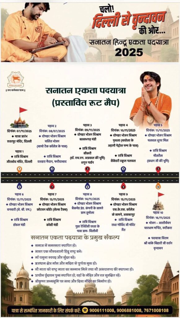 ब्रेकिंग न्यूज़ मथुरा वृंदावन एम डी न्यूज़ रिपोर्टर जितेंद्र आगरा मंडल ब्यूरो प्रमुख कोसीकलां। बागेश्वर धाम के पीठाधीश्वर धीरेंद्र कृष्ण शास्त्री की सनातन एकता पदयात्रा की तैयारियों तेज हो गई हैं। यात्रा के पड़ाव के दौरान क्षेत्र में मांस व मदिरा की दुकानें बंद कराई जाएंगी। रविवार को गन्ना विकास एवं चीनी मिल मंत्री लक्ष्मीनारायण चौधरी ने डीएम व एसएसपी के साथ अनाज मंडी आदि पड़ाव स्थलों का निरीक्षण किया। उन्होंने व्यवस्थाओं से संबंधित जानकारी की और निर्देश दिए। सनातन एकता पदयात्रा सात नवंबर को दिल्ली के छतरपुर मंदिर से प्रारंभ होकर वृंदावन के बांकेबिहारी मंदिर तक जाएगी। सनातन पदयात्रा का 13 नवंबर को कोसीकलां एवं 15 नवंबर को छाता और चौमुहां में ठहराव रहेगा। पदयात्रा के आगमन और प्रबंधन को लेकर मंत्री चौधरी लक्ष्मीनारायण ने डीएम सीपी सिंह और एसएसपी श्लोक कुमार समेत अन्य अधिकारियों के साथ पड़ाव स्थलों का निरीक्षण किया।
