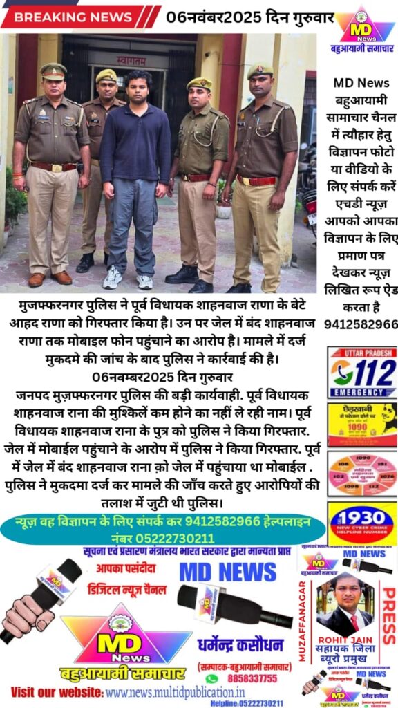 मुजफ्फरनगर पुलिस ने पूर्व विधायक शाहनवाज राणा के बेटे आहद राणा को गिरफ्तार किया है। उन पर जेल में बंद शाहनवाज राणा तक मोबाइल फोन पहुंचाने का आरोप है। मामले में दर्ज मुकदमे की जांच के बाद पुलिस ने कार्रवाई की है।MD News बहुआयामी सामाचार चैनलजिला सहायक ब्यूरो प्रमुख रोहित जैन जनपद मुजफ्फरनगर06नवम्बर2025 दिन गुरुवारजनपद मुज़फ्फरनगर पुलिस की बड़ी कार्यवाही. पूर्व विधायक शाहनवाज राना की मुश्किलें कम होने का नहीं ले रही नाम। पूर्व विधायक शाहनवाज राना के पुत्र को पुलिस ने किया गिरफ्तार. जेल में मोबाईल पहुंचाने के आरोप में पुलिस ने किया गिरफ्तार. पूर्व में जेल में बंद शाहनवाज राना क़ो जेल में पहुंचाया था मोबाईल . पुलिस ने मुकदमा दर्ज कर मामले की जाँच करते हुए आरोपियों की तलाश में जुटी थी पुलिस।
