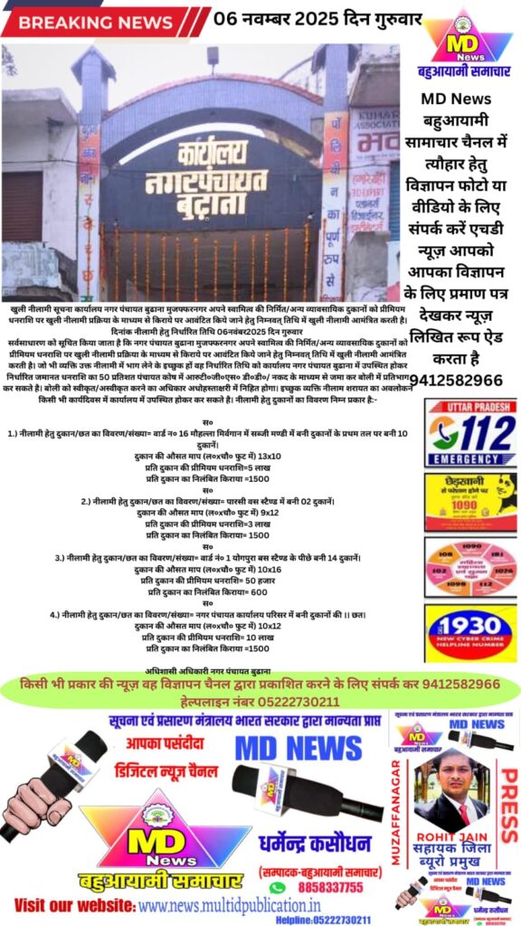 सर्वसाधारण को सूचित किया जाता है कि नगर पंचायत बुढाना मुजफ्फरनगर अपने स्वामित्व की निर्मित/अन्य व्यावसायिक दुकानों को प्रीमियम धनराशि पर खुली नीलामी प्रक्रिया के माध्यम से किराये पर आवंटित किये जाने हेतु निम्नवत् तिथि में खुली नीलामी आमंत्रित करती है। जो भी व्यक्ति उक्त नीलामी में भाग लेने के इच्छुक हों वह निर्धारित तिथि को कार्यालय नगर पंचायत बुढाना में उपस्थित होकर निर्धारित जमानत धनराशि का 50 प्रतिशत पंचायत कोष में आरुटी०जी०एस० डी०डी०/ नकद के माध्यम से जमा कर बोली में प्रतिभाग कर सकते है। बोली को स्वीकृत/अस्वीकृत करने का अधिकार अधोहस्ताक्षरी में निहित होगा। इच्छुक व्यक्ति नीलाम शरायत का अवलोकन किसी भी कार्यदिवस में कार्यालय में उपस्थित होकर कर सकते है। नीलामी हेतु दुकानों का विवरण निम्न प्रकार है:-