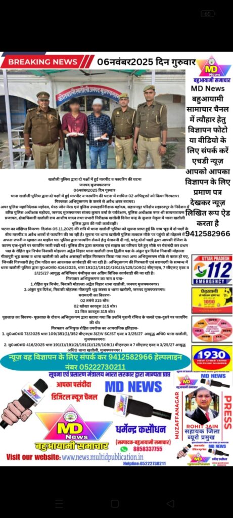 घटना का संक्षिप्त विवरण- दिनांक 05.11.2025 की रात्रि में थाना खतौली पुलिस को सूचना प्राप्त हुई कि ग्राम भूड़ में दो पक्षों के बीच मारपीट व अवैध शस्त्रों से फायरिंग की जा रही है। सूचना पर थाना खतौली पुलिस तत्काल मौके पर पहुंची तो मोहल्ले में अफरा-तफरी व दहशत का माहौल था। पुलिस द्वारा फायरिंग रोकने हेतु चेतावनी दी गई, परंतु दोनों पक्षों द्वारा आपसी रंजिश के कारण एक-दूसरे पर फायरिंग जारी रखी गई। पुलिस टीम द्वारा तत्परता एवं साहस का परिचय देते हुए मौके पर घेराबंदी कर प्रथम पक्ष के रोहित पुत्र निर्भय निवासी मोहल्ला अद्वैत विहार थाना खतौली तथा द्वितीय पक्ष के अंकुर पुत्र दिनेश निवासी मोहल्ला गीतापुरी भूड़ कस्बा व थाना खतौली को अवैध असलहों सहित गिरफ्तार किया गया तथा अन्य अभियुक्तगण मौके से फरार हो गए, जिनकी गिरफ्तारी हेतु टीम गठित कर आवश्यक कार्यवाही की जा रही है। अभियुक्तगण की गिरफ्तारी एवं बरामदगी के सम्बन्ध में थाना खतौली पुलिस द्वारा मु0अ0सं0 416/2025, धारा 191(1)/191(2)/191(3)/125/109(1) बीएनएस, 7 सीएलए एक्ट व 3/25/27 आयुद्ध अधिनियम पंजीकृत कर अग्रिम विधिक कार्यवाही की जा रही है।
