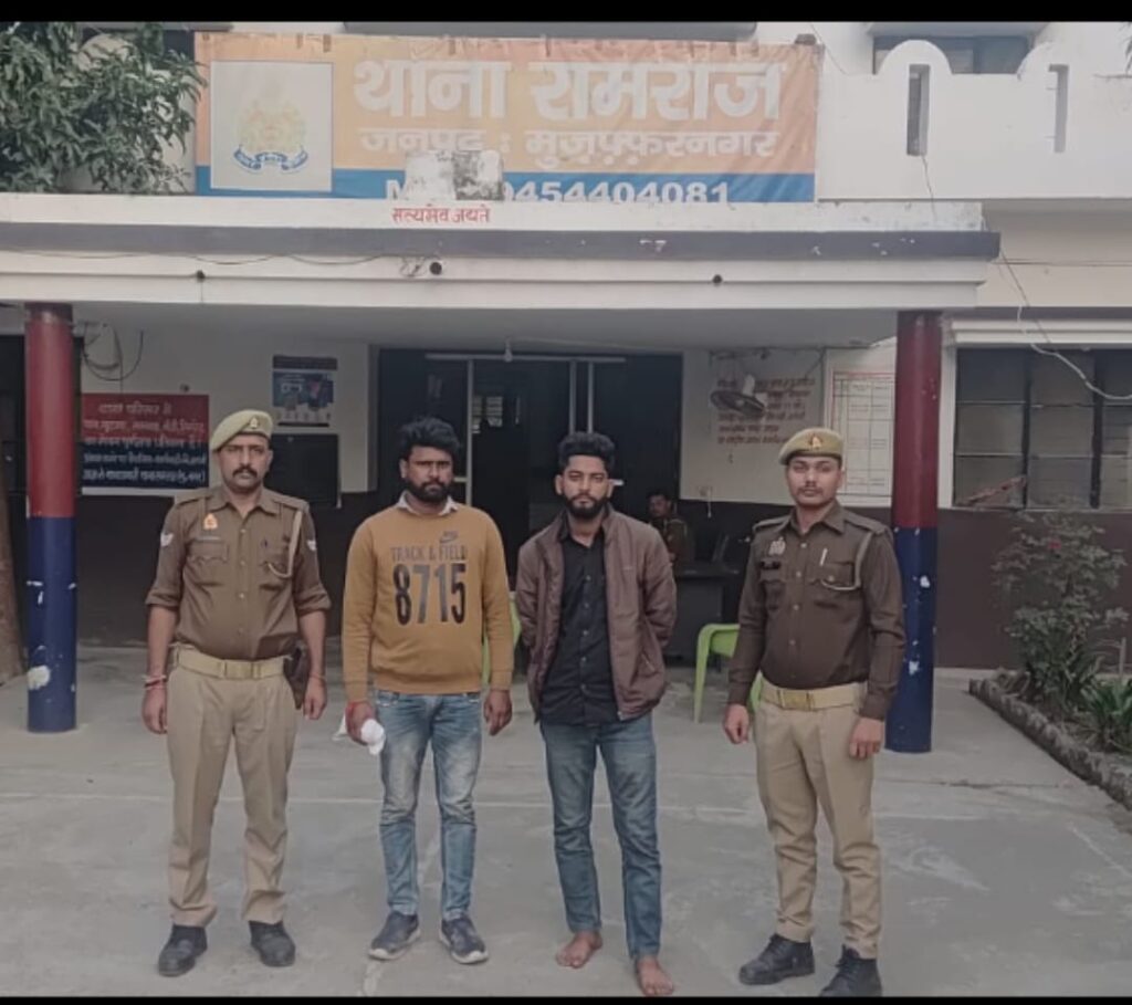 मुजफ्फरनगर,रामराज। वरिष्ठ पुलिस अधीक्षक संजय वर्मा जनपद मुजफ्फरनगर के दिशा निर्देशन में व क्षेत्र अधिकारी यतेंद्र सिंह नागर जानसठ एवं थाना रामराज प्रभारी रवेंद्र सिंह यादव के कुशल नेतृत्व में आज दिनांक 6.11.2025 को थाना रामराज क्षेत्र के ग्राम हंसावाला मे वादी मदन प्रधान ने थाना रामराज को एक तहरी देकर बताया दो युवकों में किसी बात को लेकर आपस में विवाद हो गया था। तो थाना रामराज पुलिस टीम उप निरीक्षक हर्षित शर्मा व कांस्टेबल धवेरन्द्र र्सिंह ,आदि ने उन दोनों अभियुक्तों आशीष पुत्र वीरेंद्र व गौरव पुत्र मदनपाल उर्फ डिप्टी निवासी मोहल्ला आशारमपुरी थाना रामराज जनपद मुजफ्फरनगर को गिरफ्तार कर माननीय न्यायालय जानसठ के समक्ष पेश किया गया।