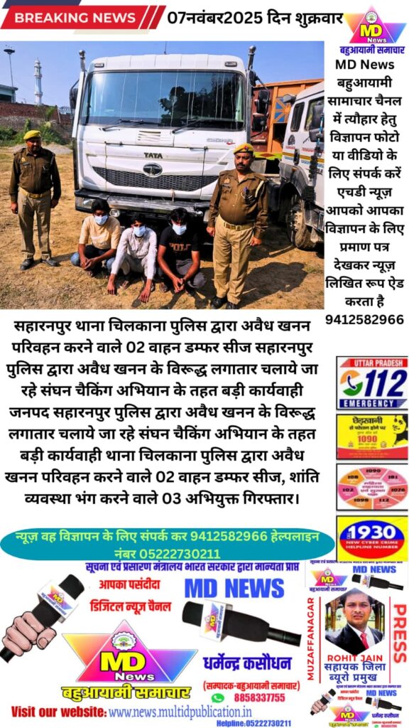 जनपद सहारनपुर पुलिस द्वारा अवैध खनन के विरूद्ध लगातार चलाये जा रहे संघन चैकिंग अभियान के तहत बड़ी कार्यवाही थाना चिलकाना पुलिस द्वारा अवैध खनन परिवहन करने वाले 02 वाहन डम्फर सीज, शांति व्यवस्था भंग करने वाले 03 अभियुक्त गिरफ्तार।