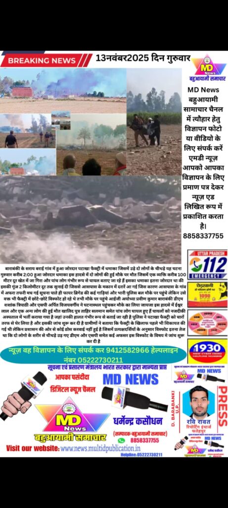 बाराबंकी के सराय बराई गांव में हुआ जोरदार पटाखा फैक्ट्री में धमाका जिसमें उड़े दो लोगों के चीथड़े यह घटना गुरुवार करीब 2:00 हुआ जोरदार धमाका इस हादसे में दो लोगों की हुई मौके पर मौत जिसमें एक व्यक्ति करीब 100 मीटर दूर खेत में जा गिरा और पांच लोग गंभीर रूप से घायल बताए जा रहे हैं इसका धमाका इतना जोरदार था की इसकी गूंज 2 किलोमीटर दूर तक सुनाई दी जिससे आसपास के मकान में दरारें आ गई जिस कारण आसपास के गांव में अफरा तफरी मच गई सूचना पाते ही फायर ब्रिगेड की कई गाड़ियां और भारी पुलिस बल मौके पर पहुंचे लेकिन उसे वक्त भी फैक्ट्री में छोटे-छोटे विस्फोट हो रहे थे तभी मौके पर पहुंचे आईजी अयोध्या प्रवीण कुमार बाराबंकी डीएम शशांक त्रिपाठी और एसपी अर्पित विजयवर्गीय ने घटनास्थल पहुंचकर मौके का लिया जायजा इस हादसे में ईश्वर लाल और एक अन्य लोग की हुई मौत खालिद पुत्र ताहिर सलमान समेत पांच लोग घायल हुए हैं घायलों को नजदीकी अस्पताल में भर्ती कराया गया है जहां उनकी हालत गंभीर रूप से बताई जा रही है पुलिस ने पटाखा फैक्ट्री को चारों तरफ से घेर लिया है और इसकी जांच शुरू कर दी है ग्रामीणों ने बताया कि फैक्ट्री के खिलाफ पहले भी शिकायत की गई थी लेकिन प्रशासन की ओर से कोई ठोस करवाई नहीं हुई है जिसमें प्रत्यक्षदर्शियों के अनुसार विस्फोट इतना तेज था कि दो लोगो के शरीर से चीथड़े उड़ गए डीएम और एसपी समेत कई अफसर इस विस्फोट के विषय मे जांच शुरू कर दी है।