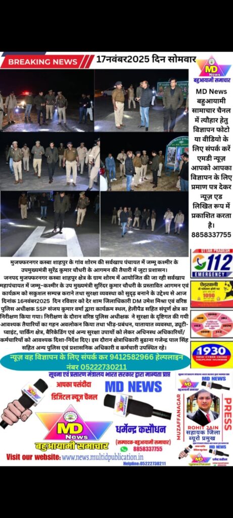 जनपद मुजफ्फरनगर कस्बा शाहपुर क्षेत्र के ग्राम शोरम में आयोजित की जा रही सर्वखाप महापंचायत में जम्मू–कश्मीर के उप मुख्यमंत्री सुरिंदर कुमार चौधरी के प्रस्तावित आगमन एवं कार्यक्रम को सकुशल सम्पन्न कराने तथा सुरक्षा व्यवस्था को सुदृढ़ बनाने के उद्देश्य से आज दिनांक 16नवंबर2025 दिन रविवार को देर शाम जिलाधिकारी DM उमेश मिश्रा एवं वरिष्ठ पुलिस अधीक्षक SSP संजय कुमार वर्मा द्वारा कार्यक्रम स्थल, हेलीपैड सहित संपूर्ण क्षेत्र का निरीक्षण किया गया। निरीक्षण के दौरान वरिष्ठ पुलिस अधीक्षक ने सुरक्षा के दृष्टिगत की गयी आवश्यक तैयारियों का गहन अवलोकन किया तथा भीड़-प्रबंधन, यातायात व्यवस्था, ड्यूटी-प्वाइंट, पार्किंग क्षेत्र, बैरिकेडिंग एवं अन्य सुरक्षा उपायों को लेकर अधिनस्थ अधिकारियों/कर्मचारियों को आवश्यक दिशा-निर्देश दिए। इस दौरान क्षेत्राधिकारी बुढाना गजेन्द्र पाल सिंह सहित अन्य पुलिस एवं प्रशासनिक अधिकारी व कर्मचारी उपस्थित रहे।