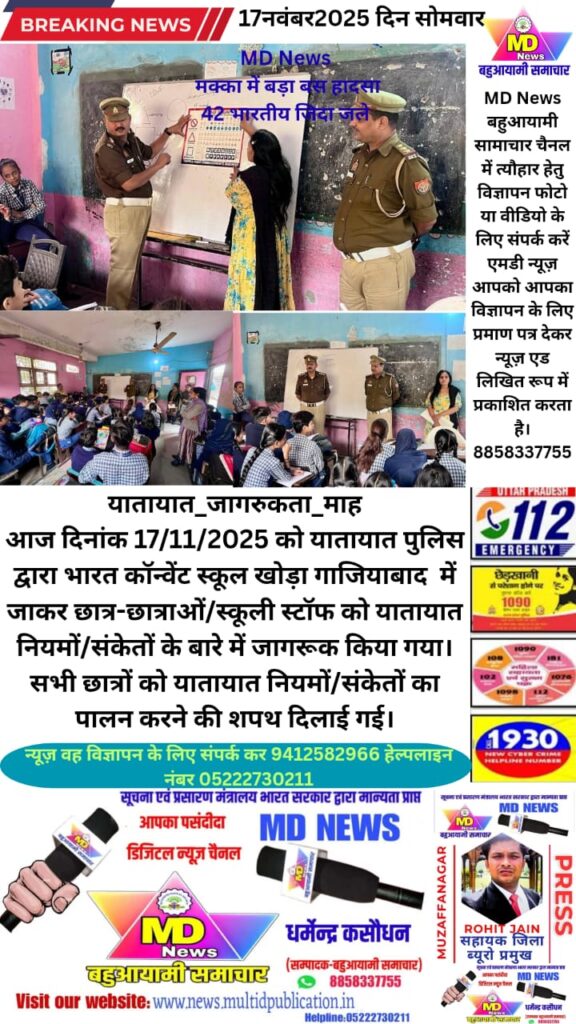 17नवंबर2025 दिन सोमवार को यातायात पुलिस द्वारा भारत कॉन्वेंट स्कूल खोड़ा गाजियाबाद में जाकर छात्र-छात्राओं/स्कूली स्टॉफ को यातायात नियमों/संकेतों के बारे में जागरूक किया गया।