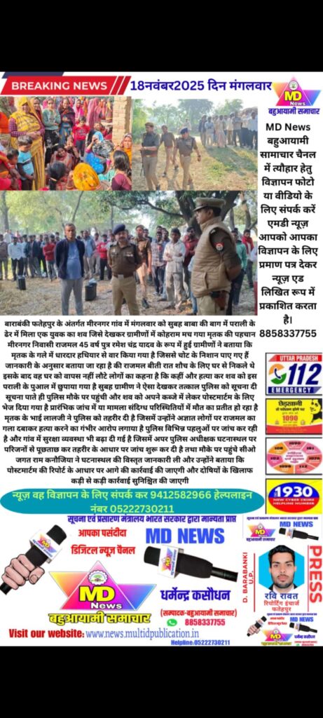 बाराबंकी फतेहपुर के अंतर्गत मीरनगर गांव में मंगलवार को सुबह बाबा की बाग में पराली के ढेर में मिला एक युवक का शव जिसे देखकर ग्रामीणों में कोहराम मच गया मृतक की पहचान मीरनगर निवासी राजमल 45 वर्ष पुत्र रमेश चंद्र यादव के रूप में हुई ग्रामीणों ने बताया कि मृतक के गले में धारदार हथियार से वार किया गया है जिससे चोट के निशान पाए गए हैं जानकारी के अनुसार बताया जा रहा है की राजमल बीती रात शौच के लिए घर से निकले थे इसके बाद वह घर को वापस नहीं लौटे लोगों का कहना है कि कहीं और हत्या कर शव को इस पराली के पुआल में छुपाया गया है सुबह ग्रामीण ने ऐसा देखकर तत्काल पुलिस को सूचना दी सूचना पाते ही पुलिस मौके पर पहुंची और शव को अपने कब्जे में लेकर पोस्टमार्टम के लिए भेज दिया गया है प्रारंभिक जांच में या मामला संदिग्ध परिस्थितियों में मौत का प्रतीत हो रहा है मृतक के भाई लालजी ने पुलिस को तहरीर दी है जिसमें उन्होंने अज्ञात लोगों पर राजमल का गला दबाकर हत्या करने का गंभीर आरोप लगाया है पुलिस विभिन्न पहलुओं पर जांच कर रही है और गांव में सुरक्षा व्यवस्था भी बढ़ा दी गई है जिसमें अपर पुलिस अधीक्षक घटनास्थल पर परिजनों से पूछताछ कर तहरीर के आधार पर जांच शुरू कर दी है तथा मौके पर पहुंचे सीओ जगत राम कनौजिया ने घटनास्थल की विस्तृत जानकारी ली और उन्होंने बताया कि पोस्टमार्टम की रिपोर्ट के आधार पर आगे की कार्रवाई की जाएगी और दोषियों के खिलाफ कड़ी से कड़ी कार्रवाई सुनिश्चित की जाएगी।