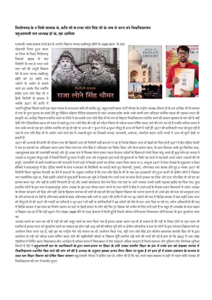 राजधानी अवध शासक तराई क्षेत्र के अंतर्गत विशाल जनपद लखीमपुर खीरी के 1800 दशक के तहत मोहम्मदी जिला हुआ करता था जिला के निकट मितौलगढ़ जिसको 1950 के बाद मितौली के नाम से जाना जाने लगा धर्म की अनूठी मिसाल देने के साथ जनपद लखीमपुर खीरी को 33 महीने तक अंग्रेजों के अधीन से बचाने वाले हम सबके प्रिय स्वर्गीय शहीद राजा लोन सिंह जी न शिर्फ मितौली के शासक थे जबकि 1857 की क्रांति में अग्रणी भूमिका निभाने वाले एक महान नायक के साथ साथ कवि भी साबित हुए, बहुआयामी संस्था पार्टी परिवार के राष्ट्रीय अध्यक्ष श्रीमान डॉ के एम आमिश जी के माध्यम से गदर के फूल पुस्तक का संदर्भ देते हुए विभिन्न सोशल मीडिया संग्रहालय से गहन अध्ययन शोध करके उनके संघर्ष त्याग बलिदान धार्मिक महत्व की पहचान भारत की संस्कृति का अनोखा मिसाल स्थापित करने पर जिले में हम सबके राजा लोने सिंह जी के नाम से विशाल विश्वविद्यालय स्थापित करने की शासन प्रशासन से मांग की है वहीं छेत्री लोग ऐतिहासिक महत्व को ध्यान में रखते हुए राजा लोने सिंह की गढ़ी को पर्यटन विभाग से पर्यटक स्थल घोषित कराए जाने की मांग कर रहे हैं जबकि वर्तमान समय में मात्र उनके नाम से एक इंटर कॉलेज स्थापित हो रहा है गढ़ी पर आज भी 7 कुआं में से 4 कुआं मौजूद हैं आज भी किले में जड़ी ईंटें 1857 की क्रांतिकारी गाथा को सुना रही हैं जहां से राजा लोने सिंह जी के अधीन आने वाले क्षेत्र में अंदरूनी सुरंग का निकासी बराबर, काच्यानी, अबगवां, अंधरौला कस्ता आदि जगहों पे आज भी सुरंगे देखी जा सकती है