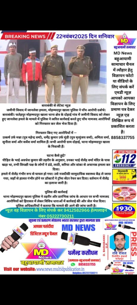 बाराबंकी। फतेहपुर मोहम्मदपुर खाला थाना क्षेत्र के दोहाई गांव में जमीनी विवाद को लेकर हुए जानलेवा हमले के मामले में पुलिस ने त्वरित कार्रवाई करते हुए पाँच नामजद आरोपियों को गिरफ्तार कर जेल भेज दिया है।