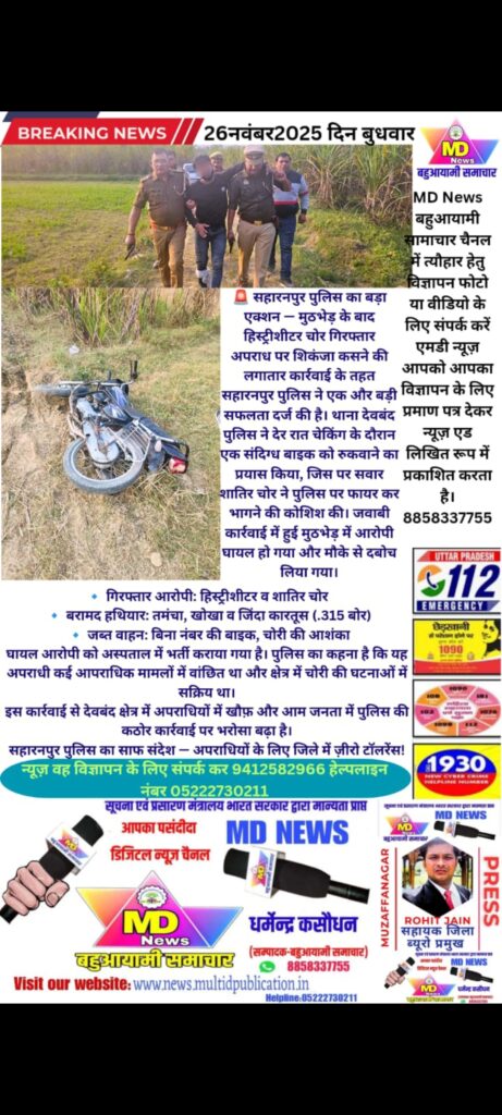 अपराध पर शिकंजा कसने की लगातार कार्रवाई के तहत सहारनपुर पुलिस ने एक और बड़ी सफलता दर्ज की है। थाना देवबंद पुलिस ने देर रात चेकिंग के दौरान एक संदिग्ध बाइक को रुकवाने का प्रयास किया, जिस पर सवार शातिर चोर ने पुलिस पर फायर कर भागने की कोशिश की। जवाबी कार्रवाई में हुई मुठभेड़ में आरोपी घायल हो गया और मौके से दबोच लिया गया।