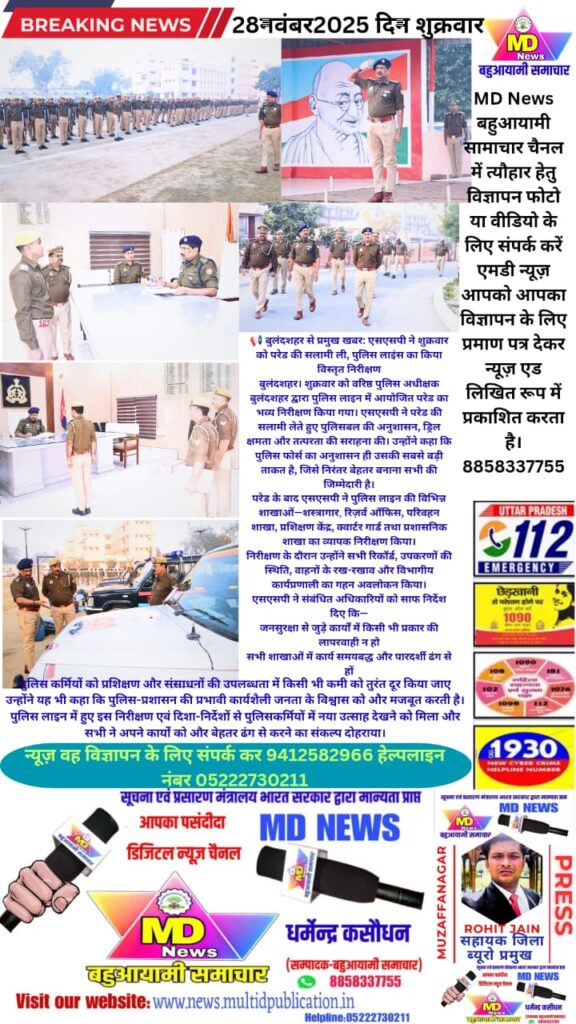 बुलंदशहर। शुक्रवार को वरिष्ठ पुलिस अधीक्षक बुलंदशहर द्वारा पुलिस लाइन में आयोजित परेड का भव्य निरीक्षण किया गया। एसएसपी ने परेड की सलामी लेते हुए पुलिसबल की अनुशासन, ड्रिल क्षमता और तत्परता की सराहना की। उन्होंने कहा कि पुलिस फोर्स का अनुशासन ही उसकी सबसे बड़ी ताकत है, जिसे निरंतर बेहतर बनाना सभी की जिम्मेदारी है।