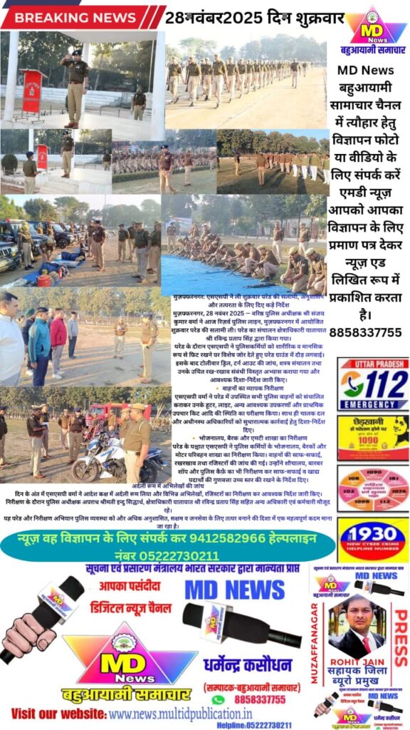 मुज़फ्फरनगर, 28 नवंबर 2025 — वरिष्ठ पुलिस अधीक्षक श्री संजय कुमार वर्मा ने आज रिज़र्व पुलिस लाइन, मुज़फ्फरनगर में आयोजित शुक्रवार परेड की सलामी ली। परेड का संचालन क्षेत्राधिकारी यातायात श्री रविन्द्र प्रताप सिंह द्वारा किया गया।