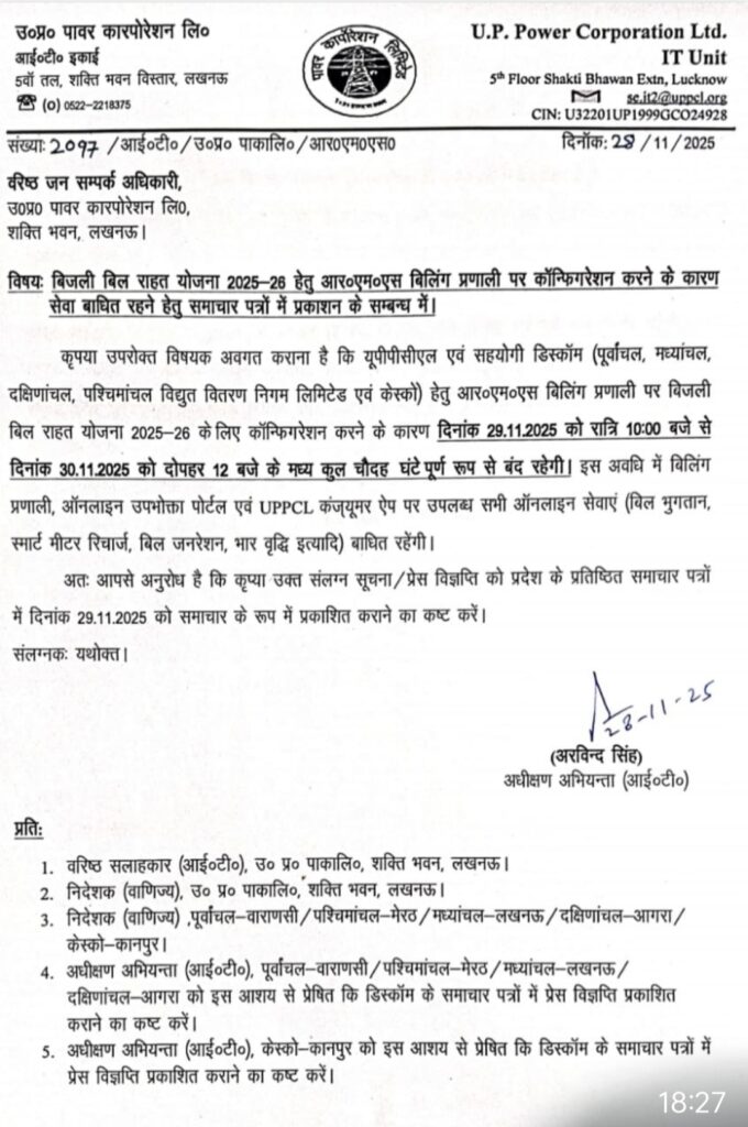 यूपी पावर कॉर्पोरेशन लिमिटेड (UPPCL) ने बिजली बिल राहत योजना 2025-26 के कॉन्फ़िगरेशन के चलते बड़ा अपडेट जारी किया है।