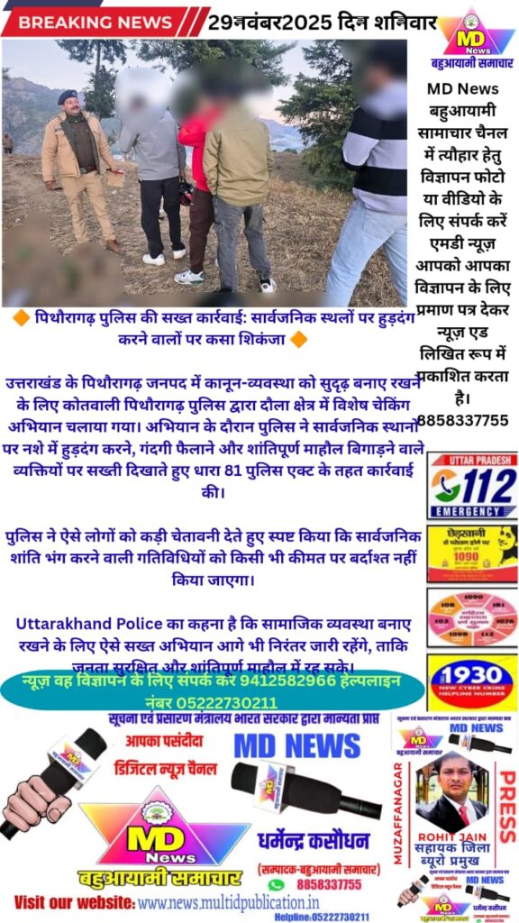 उत्तराखंड के पिथौरागढ़ जनपद में कानून-व्यवस्था को सुदृढ़ बनाए रखने के लिए कोतवाली पिथौरागढ़ पुलिस द्वारा दौला क्षेत्र में विशेष चेकिंग अभियान चलाया गया। अभियान के दौरान पुलिस ने सार्वजनिक स्थानों पर नशे में हुड़दंग करने, गंदगी फैलाने और शांतिपूर्ण माहौल बिगाड़ने वाले व्यक्तियों पर सख्ती दिखाते हुए धारा 81 पुलिस एक्ट के तहत कार्रवाई की।