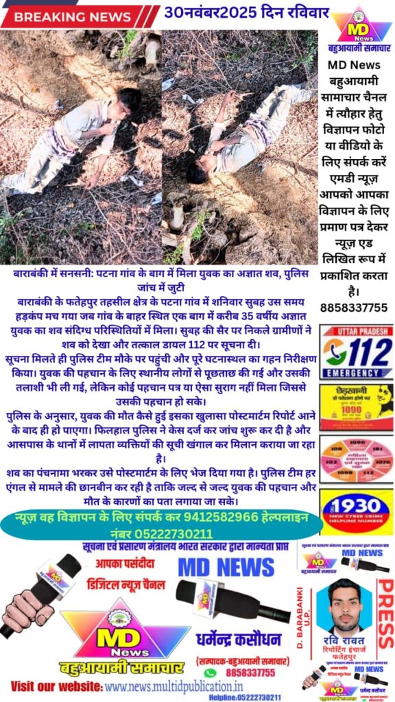 बाराबंकी जिले के फतेहपुर तहसील क्षेत्र अंतर्गत पटना गांव में शनिवार की सुबह उस समय हड़कंप मच गया जब गांव के बाहर स्थित एक बाग में करीब 35 वर्षीय अज्ञात युवक का शव संदिग्ध हालत में पड़ा मिला। सुबह टहलने निकले ग्रामीणों ने जब व्यक्ति को अचेत अवस्था में देखा तो तुरंत 112 नंबर पर सूचना दी।