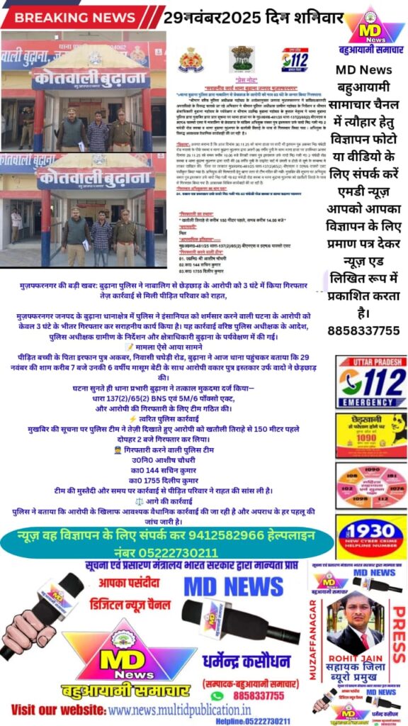 मुज़फ्फरनगर जनपद के बुढ़ाना थानाक्षेत्र में पुलिस ने इंसानियत को शर्मसार करने वाली घटना के आरोपी को केवल 3 घंटे के भीतर गिरफ्तार कर सराहनीय कार्य किया है। यह कार्रवाई वरिष्ठ पुलिस अधीक्षक के आदेश, पुलिस अधीक्षक ग्रामीण के निर्देशन और क्षेत्राधिकारी बुढ़ाना के पर्यवेक्षण में की गई।
