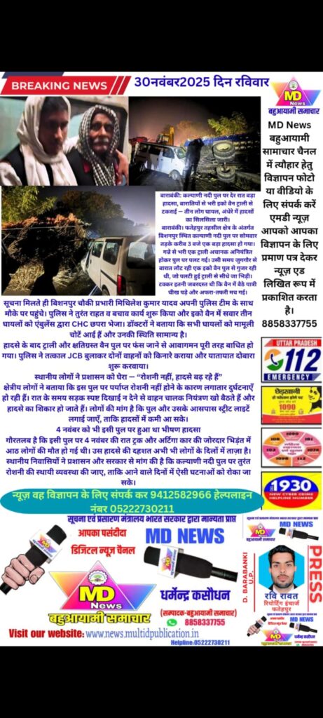 बाराबंकी। फतेहपुर तहसील क्षेत्र के अंतर्गत बिशनपुर स्थित कल्याणी नदी पुल पर सोमवार तड़के करीब 3 बजे एक बड़ा हादसा हो गया। गन्ने से भरी एक ट्राली अचानक अनियंत्रित होकर पुल पर पलट गई। उसी समय जुगगौर से बारात लौट रही एक इको वैन पुल से गुजर रही थी, जो पलटी हुई ट्राली से सीधे जा भिड़ी। टक्कर इतनी जबरदस्त थी कि वैन में बैठे यात्री चीख पड़े और अफरा-तफरी मच गई।
