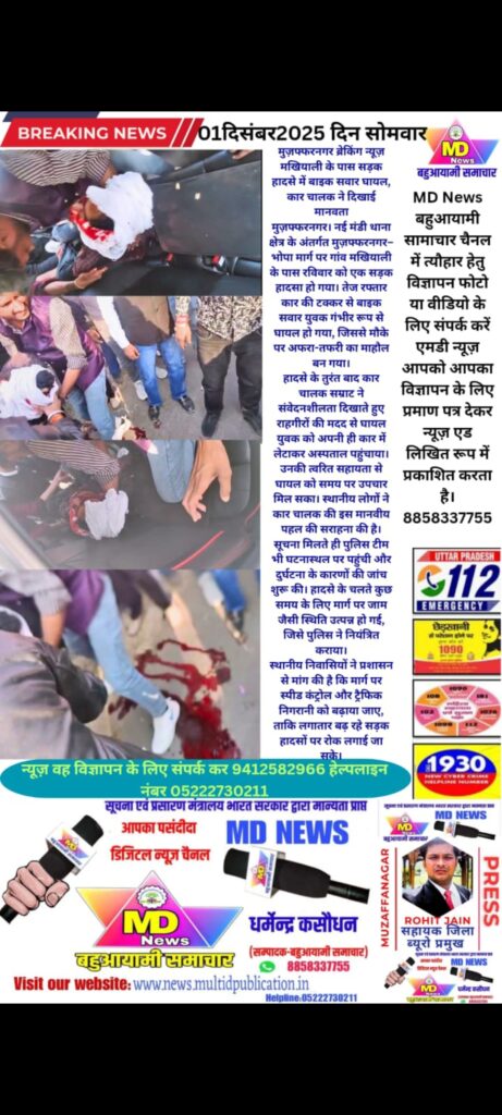 मुज़फ्फरनगर। नई मंडी थाना क्षेत्र के अंतर्गत मुज़फ्फरनगर–भोपा मार्ग पर गांव मखियाली के पास रविवार को एक सड़क हादसा हो गया। तेज रफ्तार कार की टक्कर से बाइक सवार युवक गंभीर रूप से घायल हो गया, जिससे मौके पर अफरा-तफरी का माहौल बन गया।