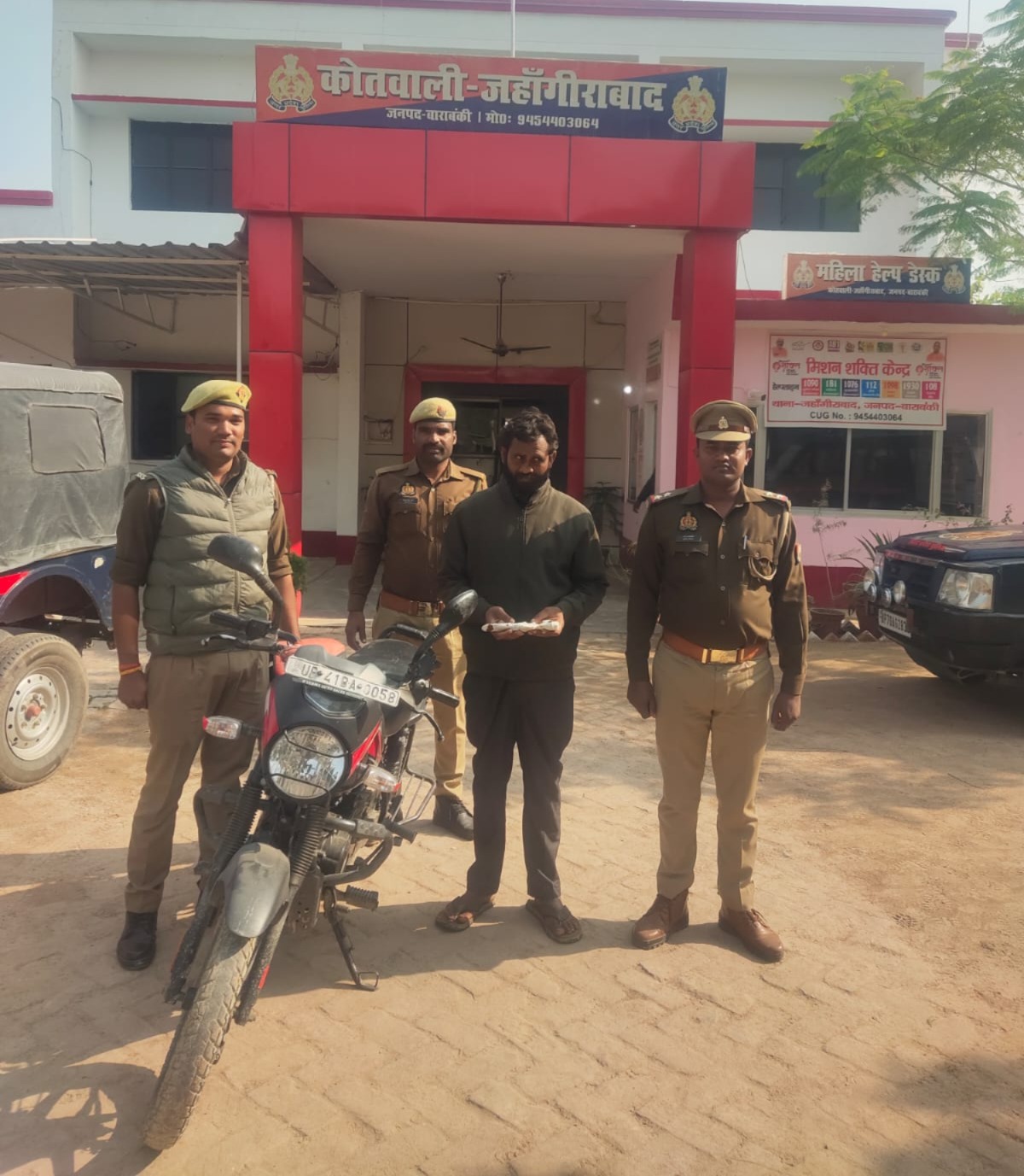 बाराबंकी। जहांगीराबाद पुलिस अधीक्षक बाराबंकी अर्पित विजयवर्गीय द्वारा जनपद में अपराध एवं अपराधियों पर अंकुश लगाने तथा जनपद में हुई वाहन चोरी की घटनाओं का शीघ्र अनावरण करने व अभियुक्त की गिरफ्तारी हेतु समस्त थाना प्रभारी को निर्देशित किया था इसी क्रम में थाना जहांगीराबाद पुलिस द्वारा मुकदमा संख्या 348 /2025 धारा 303(2) बीएन एस से संबंधित अभियुक्त सुरजीत पुत्र रामखेलावन निवासी डोंभा थाना जांगीराबाद जनपद बाराबंकी को कादिरपुर चौराहा के पास से गिरफ्तार किया गया अभियुक्त के कब्जे से चोरी की एक अदद मोटरसाइकिल यूपी 41 बीए 0058 व एक अदद अवैध तमंचा 315 बोर मय एक अदद जिंदा कारतूस बरामद किया गया बरामदगी के आधार पर थाना जहांगीराबाद कोतवाली में मुकदमा संख्या 348/2025 धारा 303(2)बीएनस पंजीकृत किया गया युवक के ऊपर कई अन्य अपराध पंजीकृत है जिसमें मुकदमा संख्या173/2015धारा8(2) एनडीपीएस मुकदमा संख्या 448 / 2011 धारा 110भादवि मुकदमा संख्या 16/2013 धारा 109 141भादवि मुकदमा संख्या 232 /2011 धारा 323 504 506 498 ए भादवि दर्ज है अभियुक्त की गिरफ्तारी में थाना अध्यक्ष श्री दुर्गा प्रसाद शुक्ला उप निरीक्षक सुनील निषाद कांस्टेबल दिनेश सागर कांस्टेबल पंकज यादव थाना जहांगीराबाद जनपद बाराबंकी कोतवाली टीम ने अभियुक्त सुरजीत को गिरफ्तार किया।