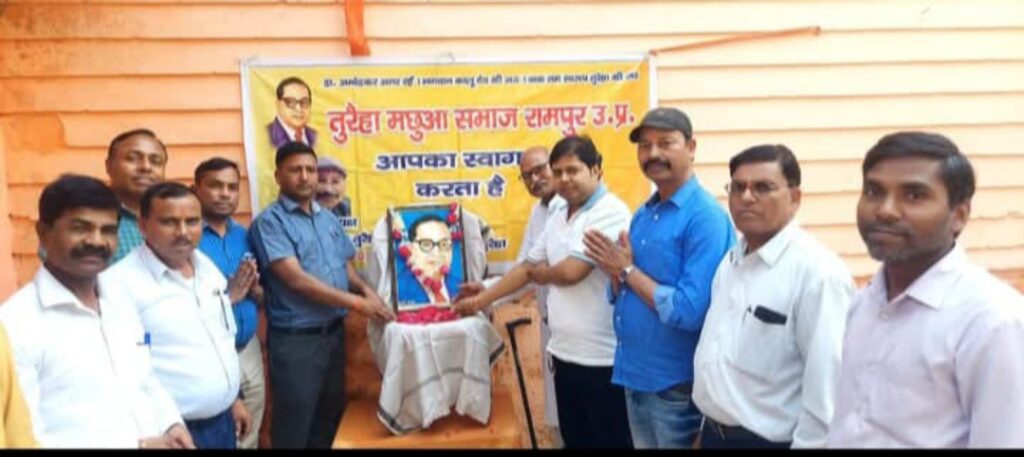 सहायक ब्यूरो चीफ रफीउल्लाह खान की स्पेशल रिपोर्ट रामपुर 6 दिसंबर तुरैहा मछुआ समाज द्वारा बाबा साहब भीमराव अंबेडकर जी का परिनिर्वाण दिवस सराए गेट स्थित बाबा रामस्वरूप तुरैहा कि समाधि संतोषी माता मंदिर पर मनाया गया। सर्वप्रथम जिला अध्यक्ष कमल कुमार तुरैहा ने बाबा साहब डॉ भीमराव अंबेडकर के चित्र पर फूल अर्पित कर उन्हें नमन किया । उन्होंने कहा कि बाबा साहब ने हमेशा कमजोर वह असहाय लोगों की आवाज को बुलंद करते हुए भारत के संविधान में उनको उचित अधिकार दिलाया। इस मौके पर सभी कार्यकर्ताओं ने उनके चित्र पर फूल अर्पण कर उनको श्रद्धांजलि दी। इस मौके पर सभासद विनोद कुमार, जिला महामंत्री राम सिंह तुरैहा एडवोकेट, अर्जुन कुमार, पंडित रामगोपाल, मुरारी लाल, दिनेश चंद, धर्म सिंह, राजीव कुमार, अरविंदराज, भुवनेश्वर चंद्र, रमेश चंद, अजय प्रधान, जावेद राम, बाल किशोर, गोविंद राम, रामकिशोर तुरैहा, विनोद कुमार, डा कृपाल सिंह,मेवीराम तुरैहा, बृजपाल सिंह, राजीव कुमार आदि लोग मौजूद रहे